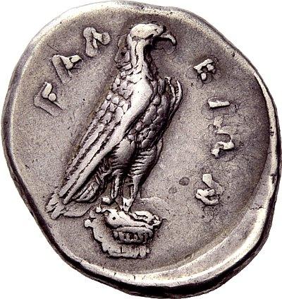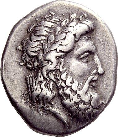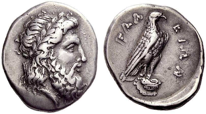 Greek coins, Elis, Stater ca. 352, 107th Olympiad, AR 11.96 g. Laureate head of Zeus r. Rev. FAL - EIWN Eagle, with closed wings, standing r. on Ionic column capital. SNG Copenhagen 386 (these dies). Seltman 188. BDC Olympia 131 (this coin). Very rare. A bold portrait of masterly style struck on a very broad flan, minor marks on obverse and unobtrusive double-striking on reverse, otherwise good very fine Ex SBV 2, 1977, 336; Poindessalut 18 June 1980, 101 and Leu 90, 2004, BDC, 131 sales. From Atalanti/North of Elis hoard (Coins Hoard II, 75).