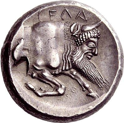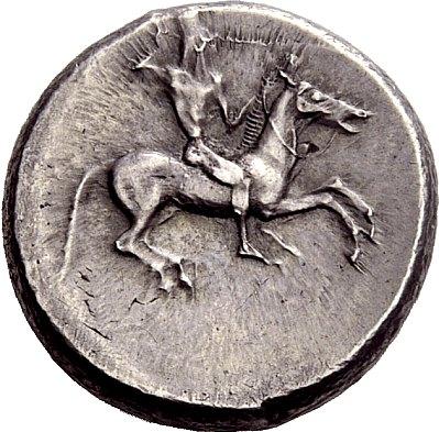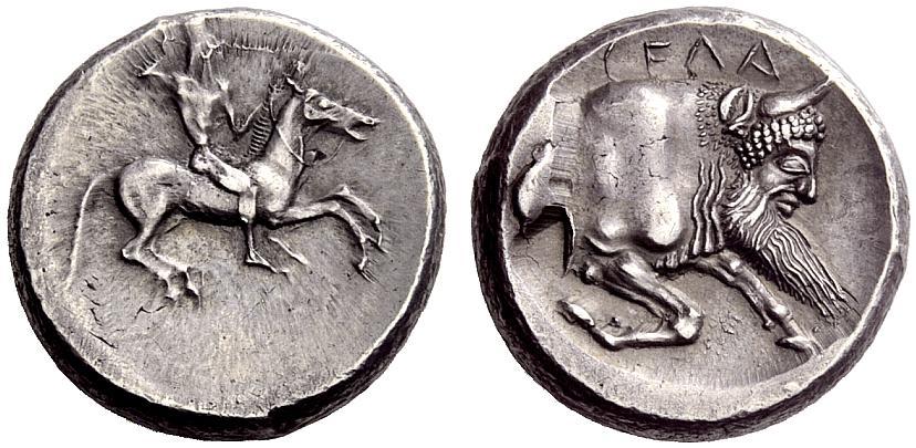 Greek coins, Gela, Didrachm ca. 490-475, AR 8.76 g. Naked horseman r., hurling javelin from upraised r. hand. Rev. CELA Forepart of man-headed bull r. SNG ANS 5 (this obverse die). Jenkins 18.27 (this coin). Lightly toned and good extremely fine From the A.D.M. collection.