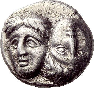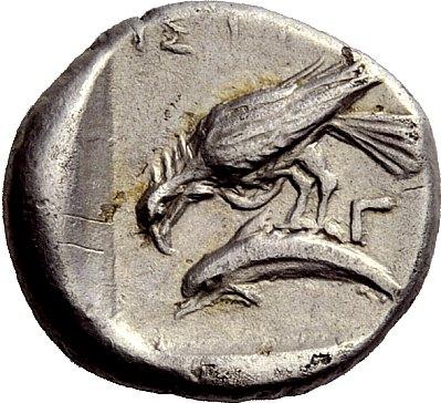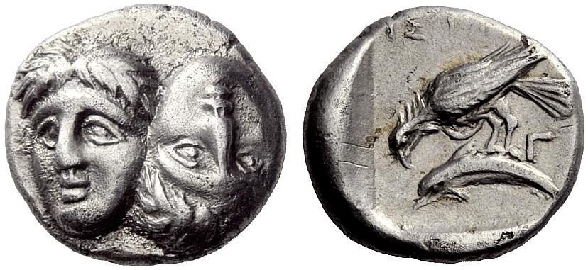 Greek coins. Istrus. Drachm late 5th-early 4th century BC, AR 6.72g. Two young male heads facing and united, one inverted. Rev. Sea eagle l. with dolphin perched in its talons. BMC Black Sea 231. Extremely fine