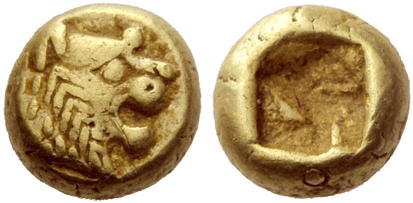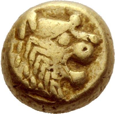 Greek coins, Kings of Lydia, uncertain king before 561, Hemihecte, Sardis before 561, EL 1.16 g. Lion’s head with open jaws; on forehead, dot. Rev. Rough incuse punch. Rosen 654. Weidauer 90. SNG Kayhan 1015. Rare. About extremely fine
