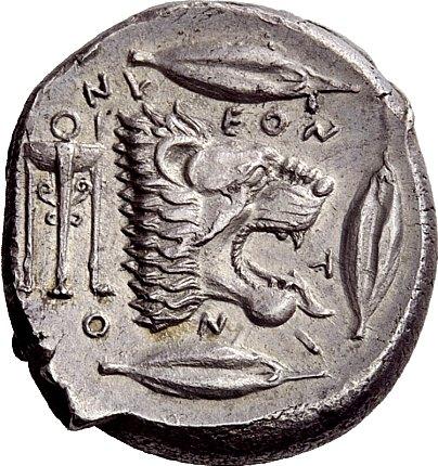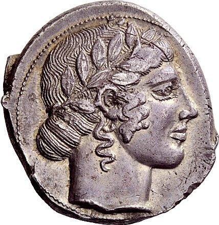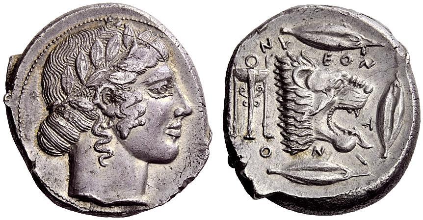 Greek coins, Leontini, Tetradrachm ca. 460-450, AR 17.28 g. Laureate head of Apollo r., hair rolled behind neck. Rev. L – EON – T – I – N – O – N Lion’s head r., with jaws open and tongue protruding; behind, tripod. Around, three barley grains. Rizzo pl. XXIII, 12 (this obverse die). SNG München 550 (these dies). Kraay-Hirmer pl. 7, 22 (these dies). de Hirsch 442 (these dies). Boehringer Studies Price, pl. 11, 33 (this obverse die). Very rare and among the finest specimens known. The finest representation of Apollo in the Leontinian coinage and the prototype of the entire series. Well struck in high relief with a lovely light tone. Almost invisible traces of overstriking on obverse, otherwise extremely fine