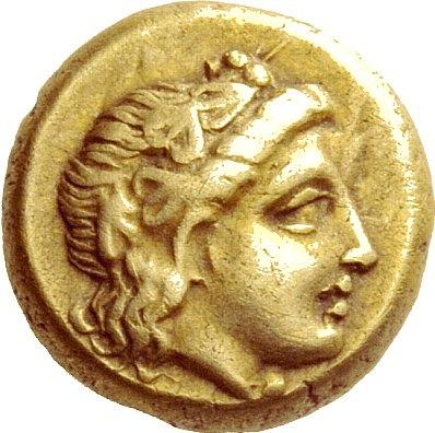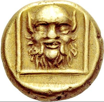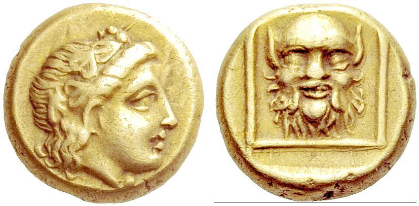 Greek coins. Lesbos, Mytilene. Hecte ca. 377-326, EL 2.53g. Head of Dionysus r., wearing ivy wreath. Rev. Head of Silenus facing, within square frame. BMC 77 (these dies). SNG Copenhagen 324 (these dies). Bodenstedt 90.l/x. About extremely fine