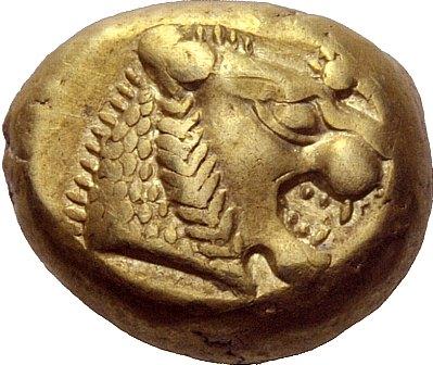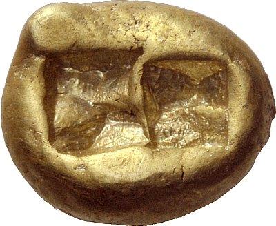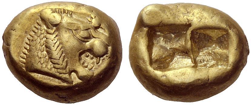 Greek coins. Lydia, Uncertain King. Trite before 561, EL 4.76g. Lion’s head r., with open jaws; on forehead, radiate dot. Rev. Rectangular bipartite incuse. Weidauer pl. 8, 67. Dewing 2423. About extremely fine