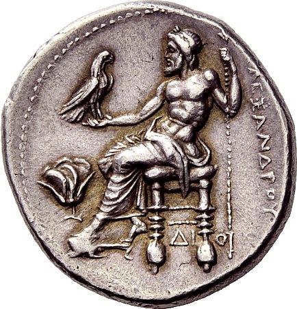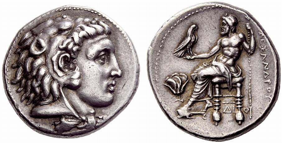 Greek coins, Kingdom of Macedonia Alexander III, 336 – 323 and posthumous issues Tetradrachm, Memphis ca. 332-323, AR 17.21 g. Head of Heracles r., wearing lion’s skin. Rev. ALEXA NDROU Zeus seated l. on throne, holding sceptre and eagle; in l. field, flower. In lower field among the throne’s legs, DI - O. Price 3971. Lovely old cabinet tone and extremely fine