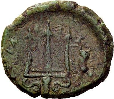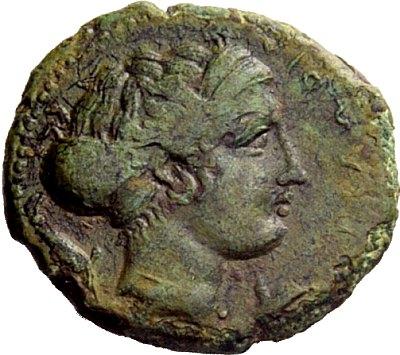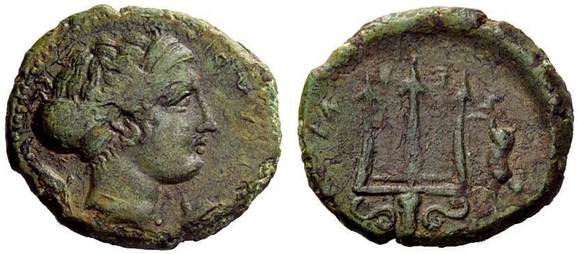 Greek coins. Messana. Hemilitra after 396, Æ 2.51g. Head of nymph Peloria r., wearing sphendone and ampyx; on either side, a dolphin. Rev. Trident; to r., hare and below, pecten. Calciati 11. Rutter, Messana, 212,2. AMB 370 (this coin). Caltabiano 368 (this coin). Rare. Lovely green patina and very fine. Ex NAC sale 13, 1998, 370.