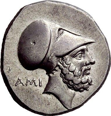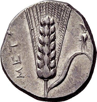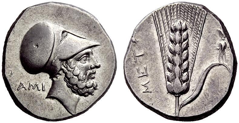 Greek coins, Metapontum, Nomos ca. 340-330, AR 7.79 g. Head of Leucippus r., wearing Corinthian helmet; behind, AMI. Rev. META Ear of barley with leaf to r., above which, thunderbolt. SNG Delepierre 332 (these dies). Johnston B 4.3. Historia Numorum Italy 1577. Struck on sound metal on a very broad flan and virtually as struck and almost Fdc