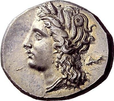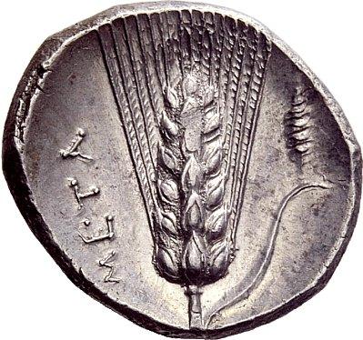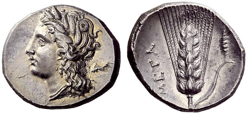 Greek coins, Metapontum, Nomos ca. 290-280, AR 7.91 g. Head of Demeter l., wearing barley wreath; behind, DI. Rev. META Ear of barley with leaf to r., on which, spindle. SNG ANS 506 (this obverse die). Johnston D 1.2. Historia Numorum Italy 1612. Struck on an exceptionally large flan, lightly toned and good extremely fine