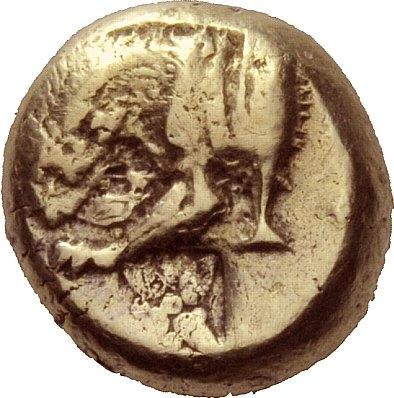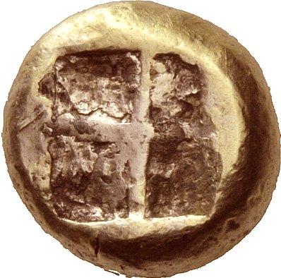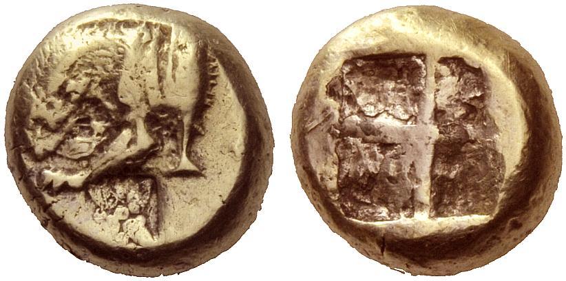 Greek coins. Mysia, Cyzicus. Hecte ca. 550-475, EL 2.53g. Forepart of lion devouring prey; behind, tunny. Rev. Quadripartite incuse square. Rosen 436. von Fritze 41. Extremely rare. countermark on obverse field, otherwise about very fine