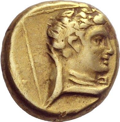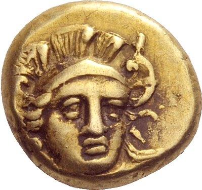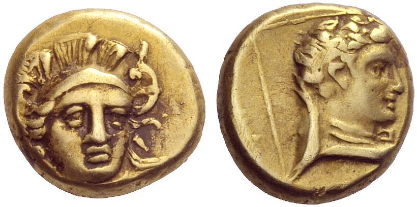 Greek coins. Mytilene. Hecte ca. 377-326, EL 2.54g. Head of Athena facing three-quarters r., wearing triple crested Attic helmete. Rev. Head of Hermes r., with petasus on back of neck; all within square frame. Boston 1734. Bodenstendt 86. Very fine