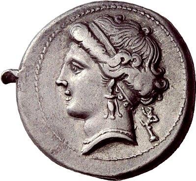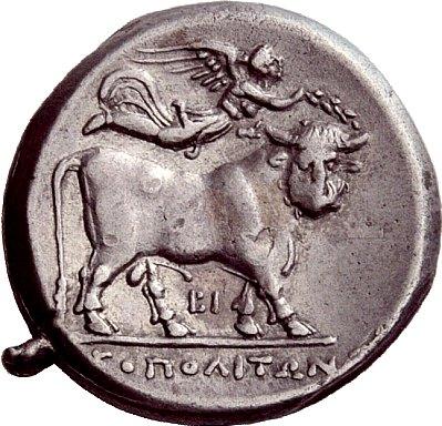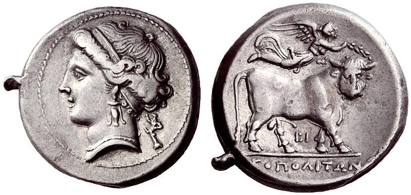 Greek coins, Neapolis, Didrachm ca. 290-270, AR 7.19 g. Diademed head of nymph Parthenope l.; behind, small statuette of ityphallic satyr. Rev. Man-headed bull walking r., crowned by Nike flying above. Between its legs, BI. In exergue, [N]EOPOLITWN. Sambon 496. SNG Copenhagen 445. SNG France 818. Historia Numorum Italy 586. Lightly toned, struck on a broad flan and about extremely fine From the A.D.M. collection.