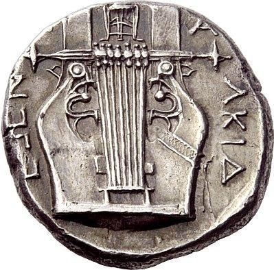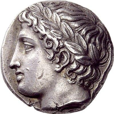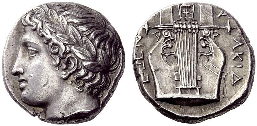 Greek coins, Olynthus, Tetradrachm ca. 370, AR 14.41 g. Laureate head of Apollo l. Rev. [C] - A - LKID - EWN Seven-stringed lyre. SNG ANS 484 (these dies). Robinson-Clement 75. Rare. An attractive example of late Classical style. Old cabinet tone, marks on cheek, otherwise extremely fine Ex Auctiones 21, 1993, 249 and Hess-Divo sale 307, 2007, P. A. collection, 1122 sales. From the collection of E. Langlotz.