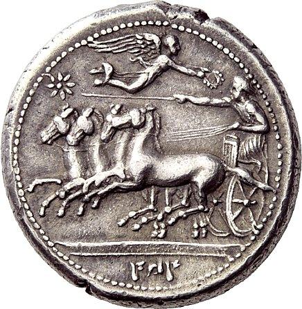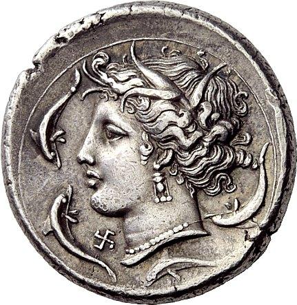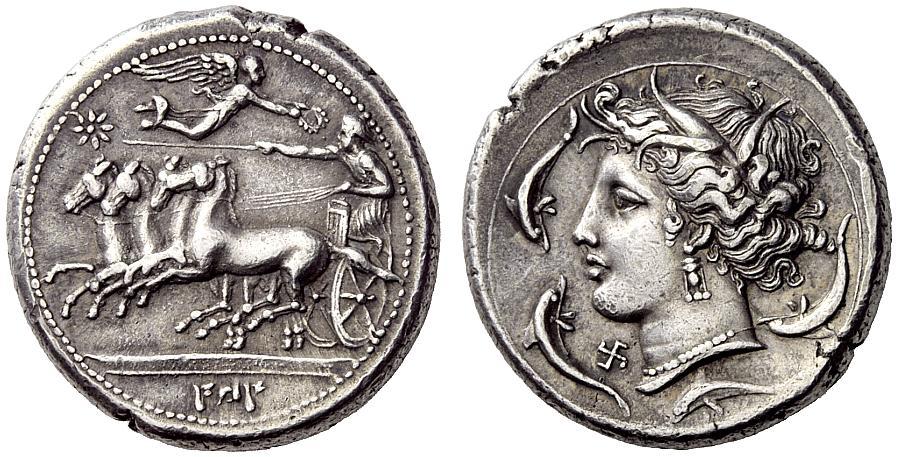 Greek coins, Panormus, Tetradrachm ca. 350-320, AR 17.06 g. Fast quadriga driven l. by charioteer, holding reins and kentron, about to be crowned by Nike flying towards him; above outer horse’s head, eight-rayed star. In exergue, sis in Punic characters. Rev. Head of Kore-Persephone l., wearing wreath of barley leaves, earring and beaded necklace; under chin, swastika. Around, four dolphins. Rizzo pl. LXVI, 1 (these dies). Jameson 691 (these dies). SNG Lloyd 1587 (these dies). AMB 374 (these dies). Jenkins Punic pl. 13, 70. Very rare and among the finest specimens known. Perfectly struck and centred on a full flan with a superb old cabinet tone, extremely fine Of all the issues of Siculo-Punic tetradrachms, those from Panormus are the most faithful to the coins of Syracuse. They were never precise copies, but in many cases even the smallest details are reproduced, leaving no doubt as to the prototype and the intent of the artist. Some early Syracuse-inspired tetradrachms of Panormus are based upon the works of Eumenes; not only are the style and composition a match for the original, but even the artist’s signature is replicated. Others are clearly copied from the works of Eucleidas, and some less-inspired works are unquestionably are based upon the decadrachms of Kimon. The sea monster (ketos) so recognisable from Syracusan tetradrachms appears in the exergue of some issues. The artistic quality in the series reached its apex with the set of dies used to strike this tetradrachm, one of the most celebrated works of Siculo-Punic coinage. This coin and its related issues are inspired by the decadrachms of Euainetos, which were familiar – even famous – in Sicily and beyond. Jenkins, in his 1971 study of the series, identifies this reverse as one of four portrait dies inspired by Euainetos’ vision of the goddess. Jenkins notes that the star before the chariot has no apparent precursor at Syracuse or elsewhere, but we can suggest that the swastika before the goddess' head is derived from the ‘cross’ that appears behind her head on one decadrachm die (Gallatin J.VIIa). This is especially plausible since one of the four Panormus reverse dies that successfully copies Euainetos’ decadrachm portrait (Jenkins 55) shows a scallop shell in front of the goddess' head, whereas it appears behind it on the Syracusan originals. Before the series at Panormus closes there occurs a transformation that favours the ‘modernistic’ style of the Artemis-Arethusa/chariot tetradrachms of the tyrant Agathocles. The affinity is unmistakable, and is principally visible in the treatment of Artemis-Arethusa. But there was a limit to the degree of reproduction, for on the issues of Panormus the chariot remains on the obverse, whereas on the Agathoclean coinage the chariot had been relegated to the reverse.