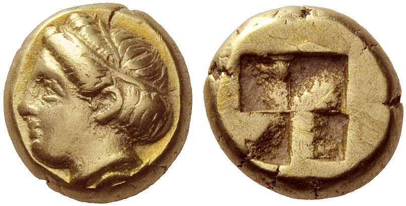 Greek coins. Phocaea. Hecte ca. 477-388, EL 2.55g. Female head l.; below neck truncation, seal. Rev. Quadripartite incuse square. Bodenstedt 90. Good very fine