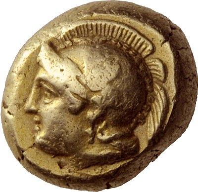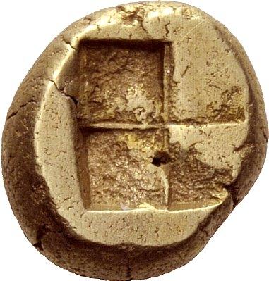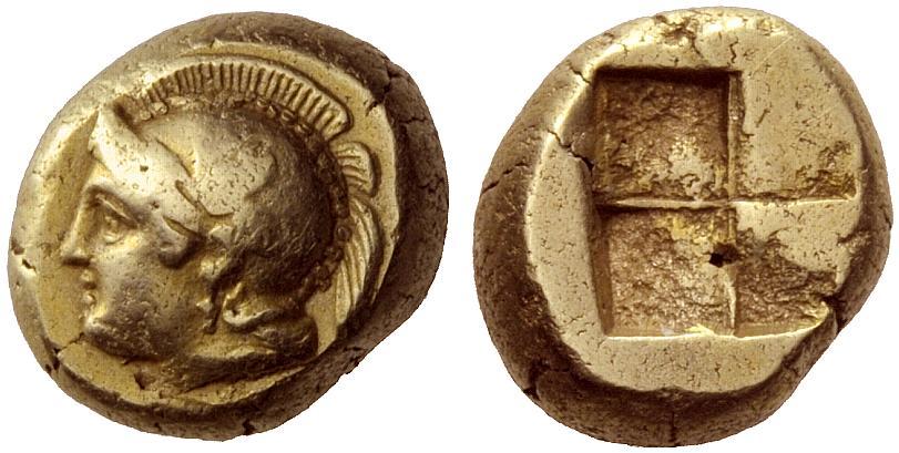 Greek coins. Phocaea. Hecte ca. 477-388, EL 2.56g. Head of Athena l., wearing Attic crested helmet; below neck truncation, seal. Rev. Quadripartite incuse square. Bodenstedt 91. Very fine