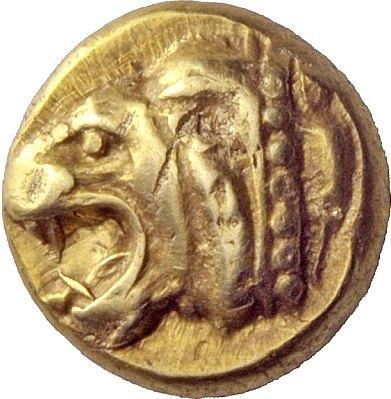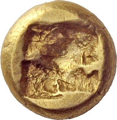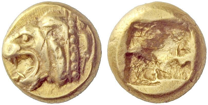 Greek coins. Phocaea. Hecte ca. 521-478, EL 2.60g. Lion’s head l., with open jaws and tongue protruding; behind, seal upwards. Rev. Irregular incuse square. de Luynes 2542 (this obverse die). Bodenstedt 38 a/-. Extremely rare. About extremely fine