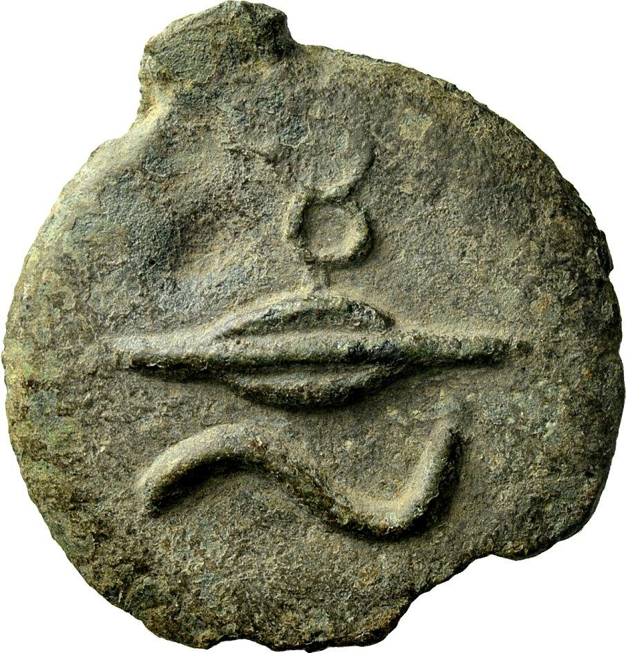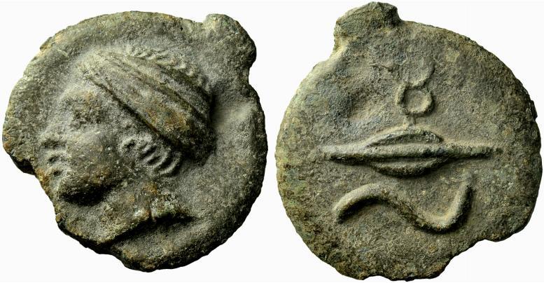 Greek coins. Uncertain mint of Central Italy. Semis first half of 3rd century BC, Æ 118.69g. Female head l.; hair bound with broad band. Rev. Ear of barley surmounted by caduceus; below, S. Haeberlin pl. 65, 7. Sydenham Aes Grave 99. Thurlow-Vecchi 197. Historia Numorum Italy 357. Extremely rare. Light green patina, about extremely fine / extremely fine