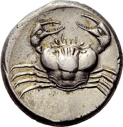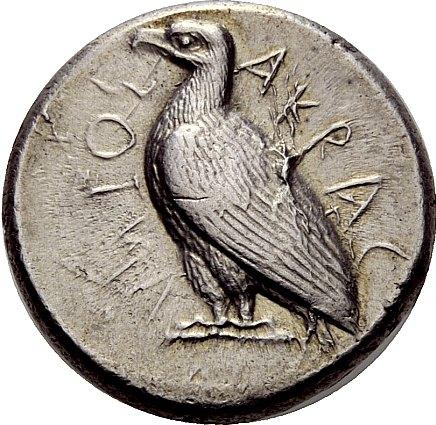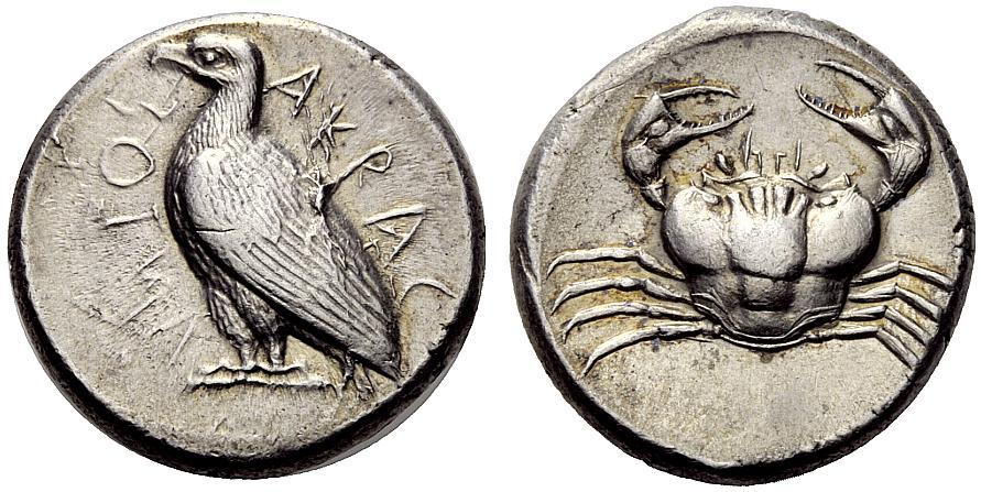 Greek coins, Sicily, Agrigentum, Tetradrachm ca. 460, AR 17.31 g. AKRAC – ANTOS Eagles standing l., with closed wings. Rev. Crab. SNG München 70 (these dies). Gulbenkian 162. Kraay-Hirmer pl. 59, 170 (these dies). SNG ANS 978 (this obverse die). Well struck and complete on a full flan, lightly toned and extremely fine