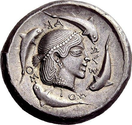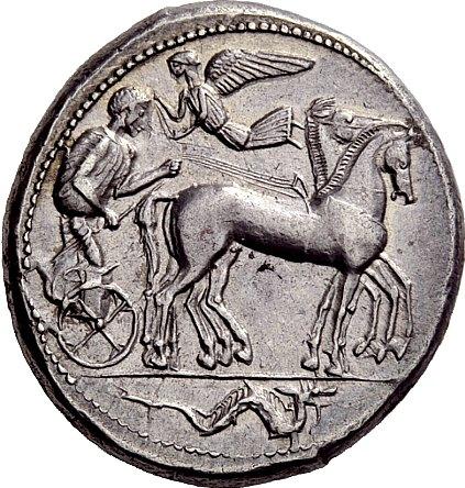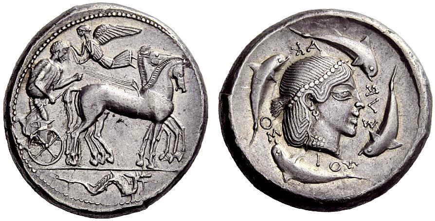 Greek coins, Syracuse, Tetradrachm of the Demareteion series ca. 480-465, AR 17.26 g. Slow quadriga driven r. by charioteer, holding kentron and reins; above, Nike flying l. to crown him; in exergue, pystrix r. Rev. SVR – AK – OS - ION Pearl diademed head of Arethusa r., surrounded by four dolphins swimming clockwise. de Nanteuil 331 (these dies). Boston 360 (these dies). Boehringer 434. Very rare and probably the finest specimen known. A magnificent issue of superb style, perfectly struck in high relief on a very broad flan. Good extremely fine Ex NAC sale 18, 2000, 120 (expertly conserved since).