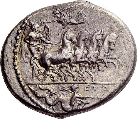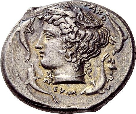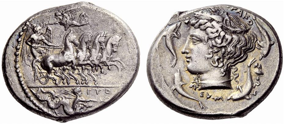 Greek coins, Syracuse, Tetradrachm signed by Euth… and Eumenos ca. 405, AR 16.96 g. Fast quadriga driven r. by winged young god, holding reins with both hands; above, Nike flying l. to crown him. In exergue, EUQ, dolphin, Scylla to r., holding trident in l. hand over l. shoulder and pursuing a fish with her outstretched r. Rev. SVRAKO-SIWN Head of Persephone or Demeter (or Arethusa with the features of Persephone or Demeter), wearing double hook earring and necklace with lion pendant; hair wreathed in barley ears, poppy heads, oak leaves and acorns; beneath neck truncation, EVM. Around, four dolphins swimming clockwise. Rizzo pl. XLIII, 11 (this reverse die). SNG ANS 273 (these dies). Kraay-Himer pl. 33, 103 (this reverse die) and pl. 37, 107 (this obverse die). AMB 460 (these dies). Tudeer 46. Very rare. One of the most impressive and fascinating Syracusan issues bearing an artistically innovative obverse, lovely iridescent tone and good very fine Ex NAC 8, 1995, 162 and NAC 29, 2005, 118 sales.