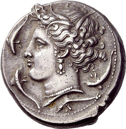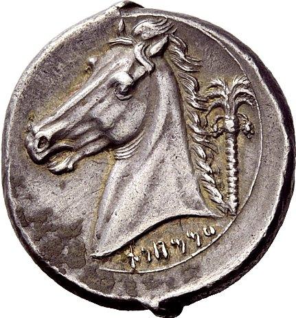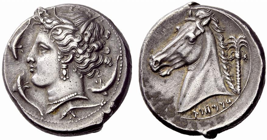 Greek coins, The Carthaginians in Sicily and North Africa, Tetradrachm, Sicily ca. 320, AR 16.95 g. Head of Tanit-Persephone l., wearing barley wreath, earring and necklace; around, four dolphins. Rev. Horse’s head l.; behind, palm tree with date clusters. Below neck truncation, ‘MMHNT in Punic characters. SNG Lloyd 1631 (these dies). de Luynes 1448 (these dies). Jenkins 148 (this coin cited). A superb specimen of fine style with an enchanting old cabinet tone and extremely fine Ex Hess-Leu sale 1956, 323.
