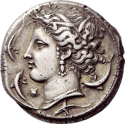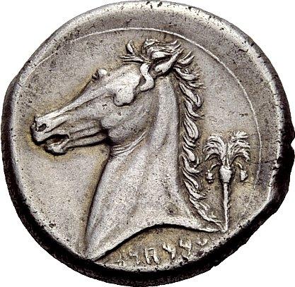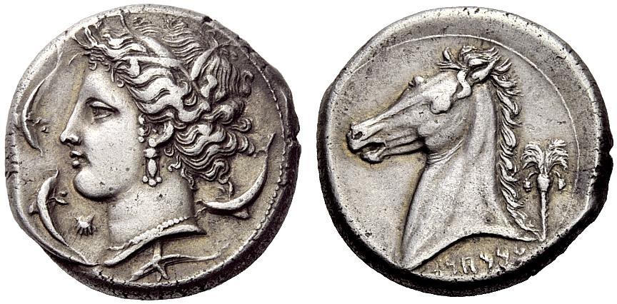 Greek coins, The Carthaginians in Sicily and North Africa, Tetradrachm, Sicily ca. 320, AR 17.20 g. Head of Tanit-Persephone l., wearing barley wreath, earring and necklace; below chin, cockle shell. Around, four dolphins. Rev. Horse’s head l.; behind, palm tree with date clusters. Below neck truncation, ‘MMHNT in Punic characters. SNG Copenhagen 85 (these dies). SNG Fitzwilliam 1488 (these dies). Jenkins 163. Lightly toned and about extremely fine