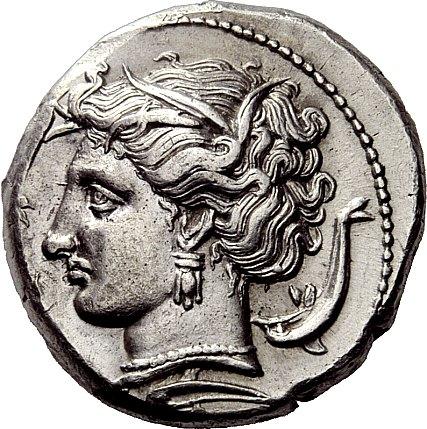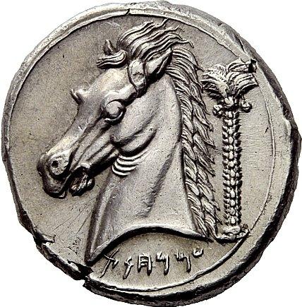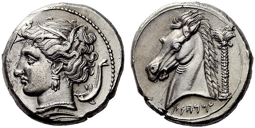 Greek coins, The Carthaginians in Sicily and North Africa, Tetradrachm ca. 320-300, AR 17.12 g. Head of Tanit-Persephone l., wearing barley wreath, earring and necklace; around, four dolphins. Rev. Horse’s head l.; behind, palm tree with date clusters. Below neck truncation, ‘MMHNT in Punic characters. de Hirsch 835 (these dies). SNG Lloyd 1638. Jenkins 188. Lightly toned and extremely fine