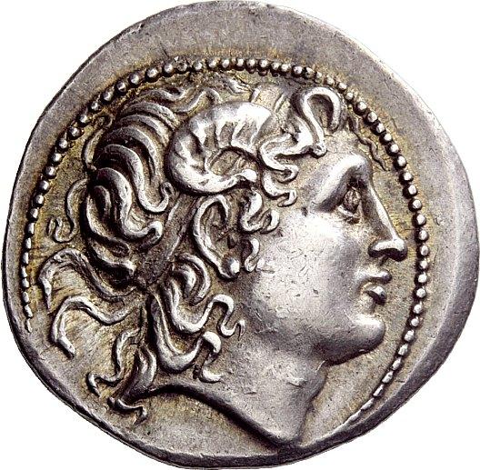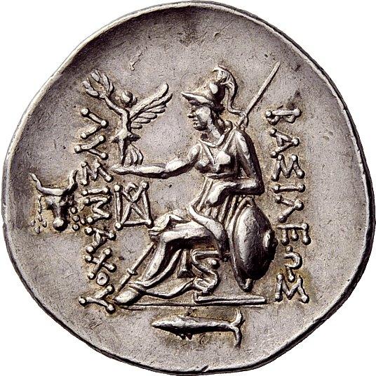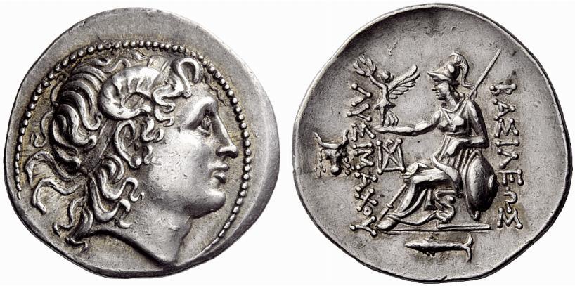 Greek coins. Kings of Thrace, Lysimachus, 327-281 and posthumous issues. Tetradrachm, Cyzicus after 281, AR 17.09g. Diademed head of deified Alexander r., with the horn of Ammon. Rev. BASILEWS–LUSIMACOU Athena enthroned l., resting l. elbow on shield decorated with lion's head, holding Nike in r. hand and shield in l.; in outer l. field, bucranium with horn ornamented with fillet. In inner l. field, monogram and in exergue, tuna l. Thompson –. Müller –. SNG France cf. 2524. Struck in high relief on a very broad flan. Lightly toned and good extremely fine