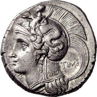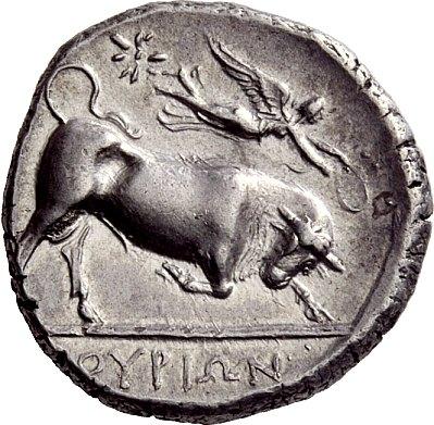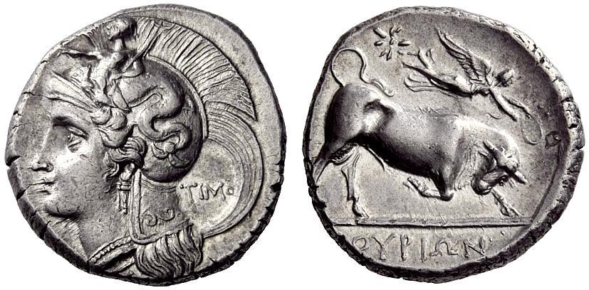 Greek coins, Thurium, Nomos ca. 350-330, AR 7.82 g. Head of Athena l., wearing crested Attic helmet decorated with Scylla holding rudder and extending r. arm; behind neck-guard, TIMO. Rev. Bull butting r. crowned by Nike; above, star. In exergue, QOURIWN. Triton sale III, 1999, 84 (this obverse die). Extremely rare, apparently only the second specimen known. Good extremely fine