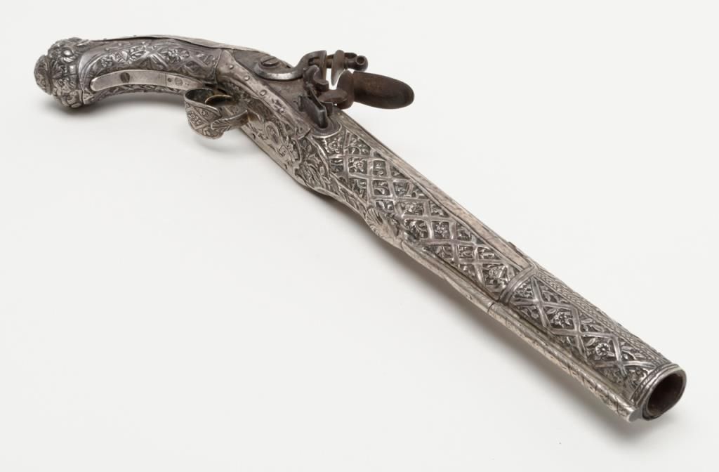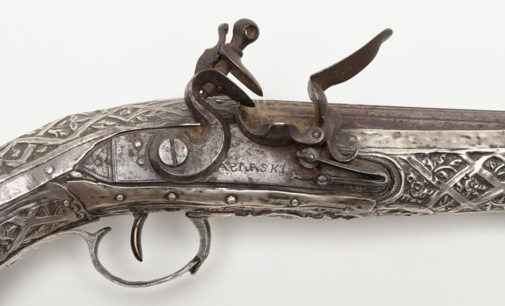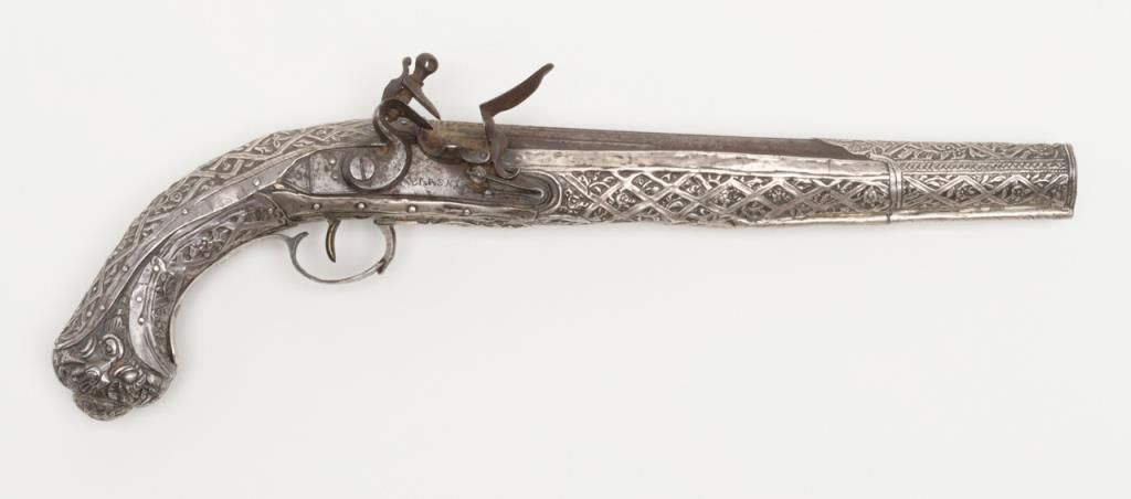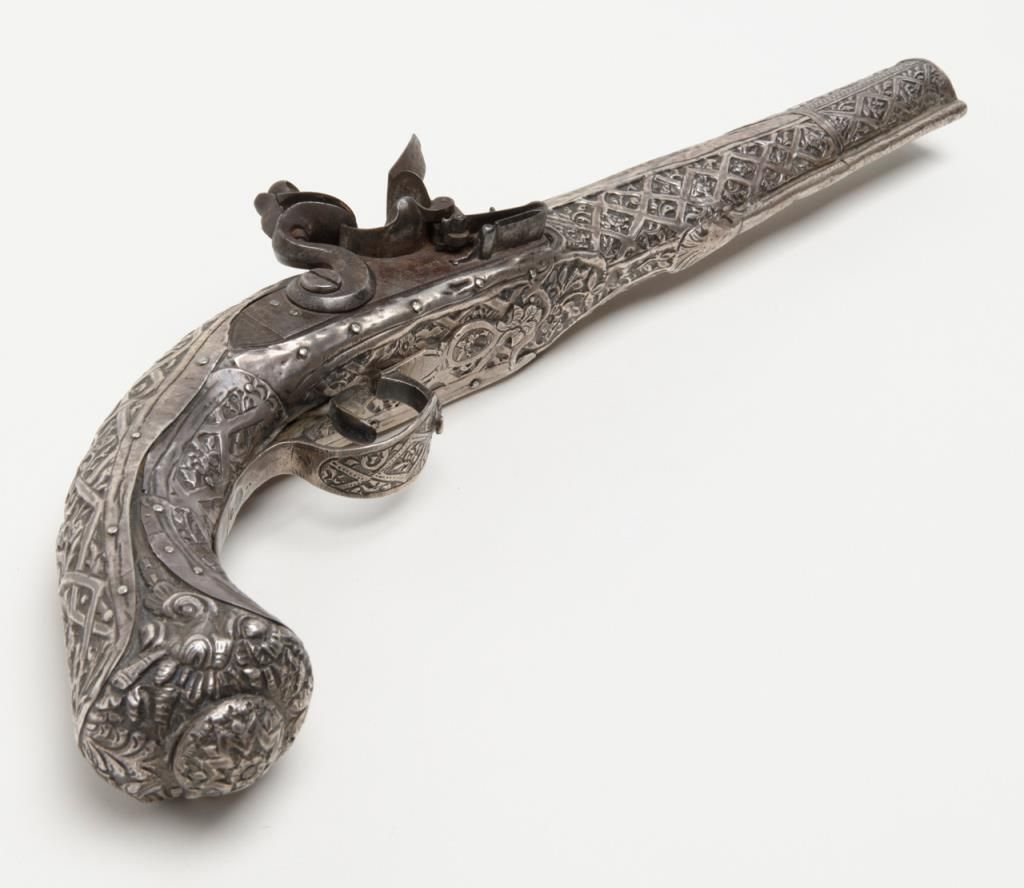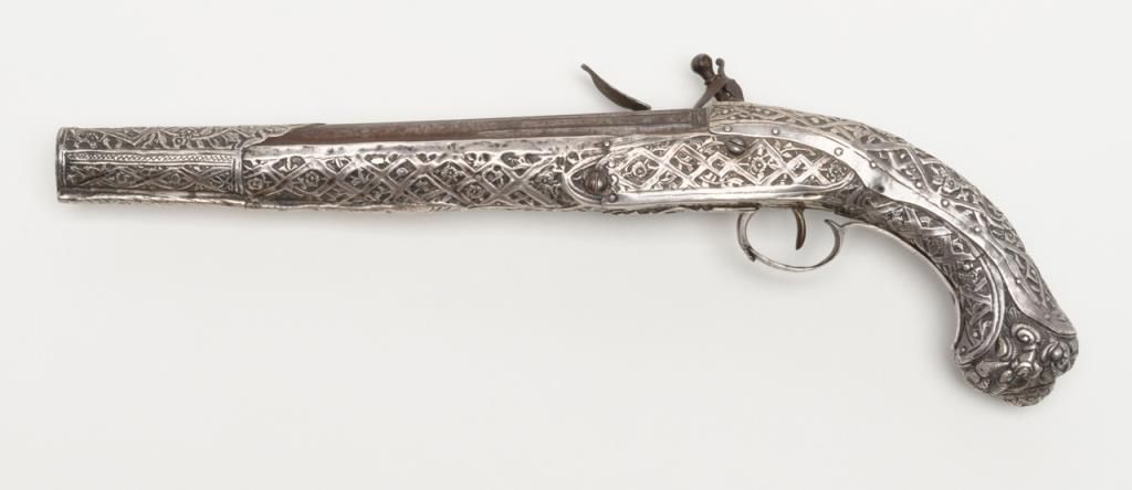Greek or Turkish hallmarked flintlock pistol, approx. 17” overall with a 10-1/2” barrel, .68 cal., highly decorated hammered metal stock work, good action, dark patina on barrel, beautifully accomplished and of high quality workmanship.(Antique). Est.: $1,500-$3,000