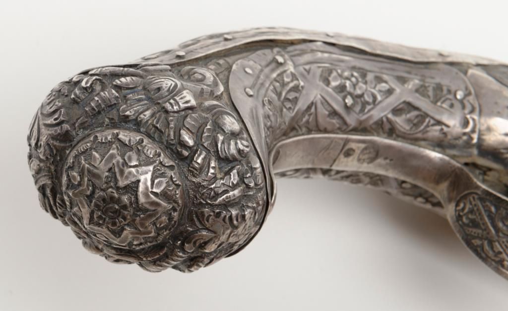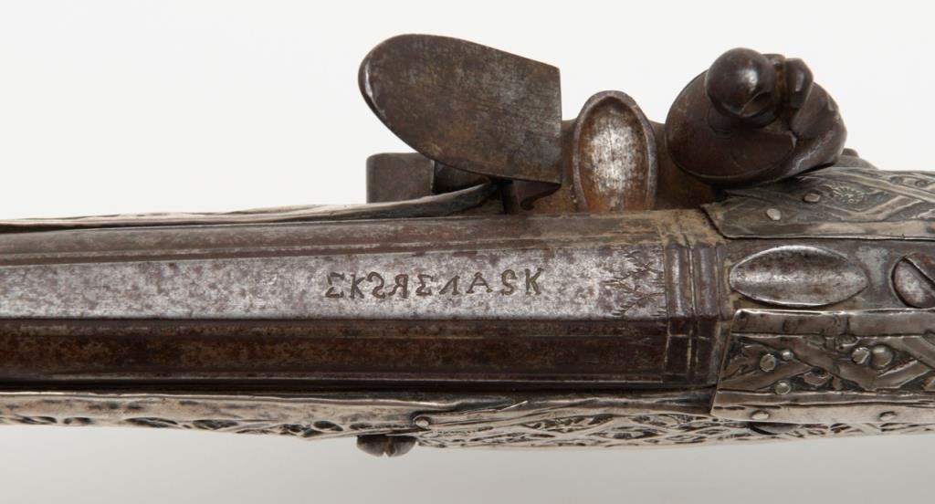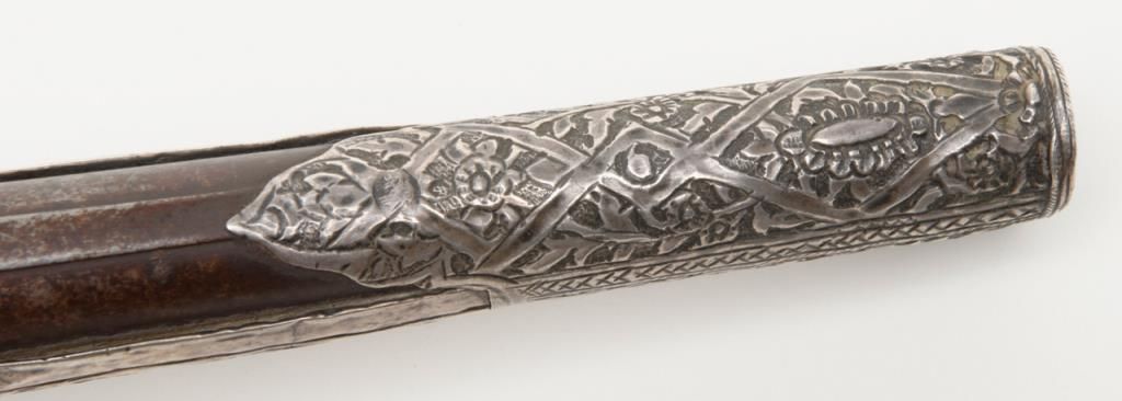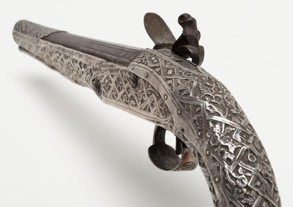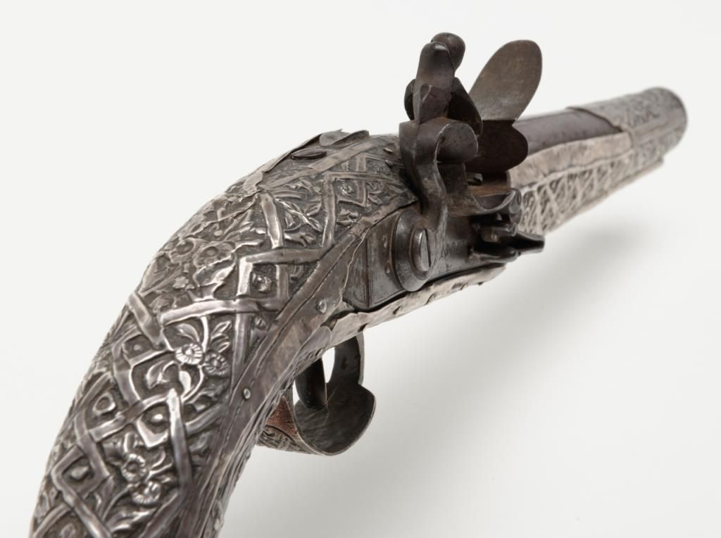 Greek or Turkish hallmarked flintlock pistol, approx. 17” overall with a 10-1/2” barrel, .68 cal., highly decorated hammered metal stock work, good action, dark patina on barrel, beautifully accomplished and of high quality workmanship.(Antique). Est.: $1,500-$3,000