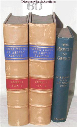 Greely, Adolphus W. THREE YEARS OF ARCTIC SERVICE. AN ACCOUNT OF THE LADY FRANKLIN BAY EXPEDITION OF 1881-1884. New York: Scribner's Sons 1886 2 vols xxv,428; xii(2)444pp. Many plates, illus & maps, incl lg. folding map in pocket. Later full polished calf binding, marbled edges & endpapers, leather labels. A few very small corners or edges chipped, else a good, clean copy, …….. with …….Schley, W. S. & J. R. Soley. THE RESCUE OF GREELY. New York: Scribner's Sons 1885 vii,277pp. Plates, 5 folding maps. Original cloth, a very good, bright copy. (3)