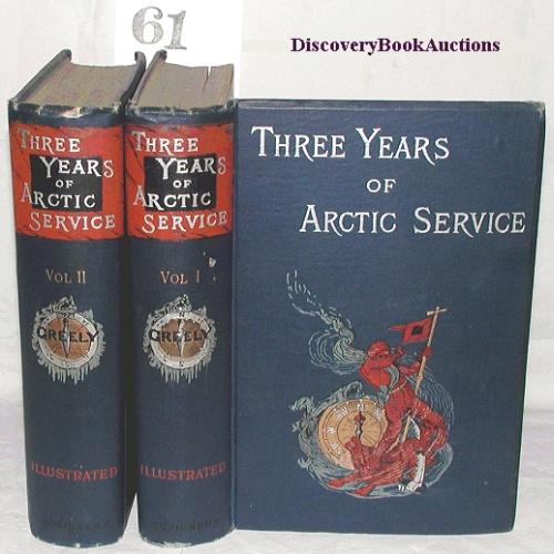 Greely, Adolphus W. THREE YEARS OF ARCTIC SERVICE. AN ACCOUNT OF THE LADY FRANKLIN BAY EXPEDITION OF 1881-1884. New York: Scribner's Sons 1886 2 vols xxv,428 ;xii(2)444pp. Many plates, illus & maps, incl lg. folding map in pocket. Original blue decorated cloth, minor edge wear, spine ends slightly frayed, back hinge vol II cracked, and lg. folding map with minor fold tears, minor stains. Withall, still quite good. (2)
