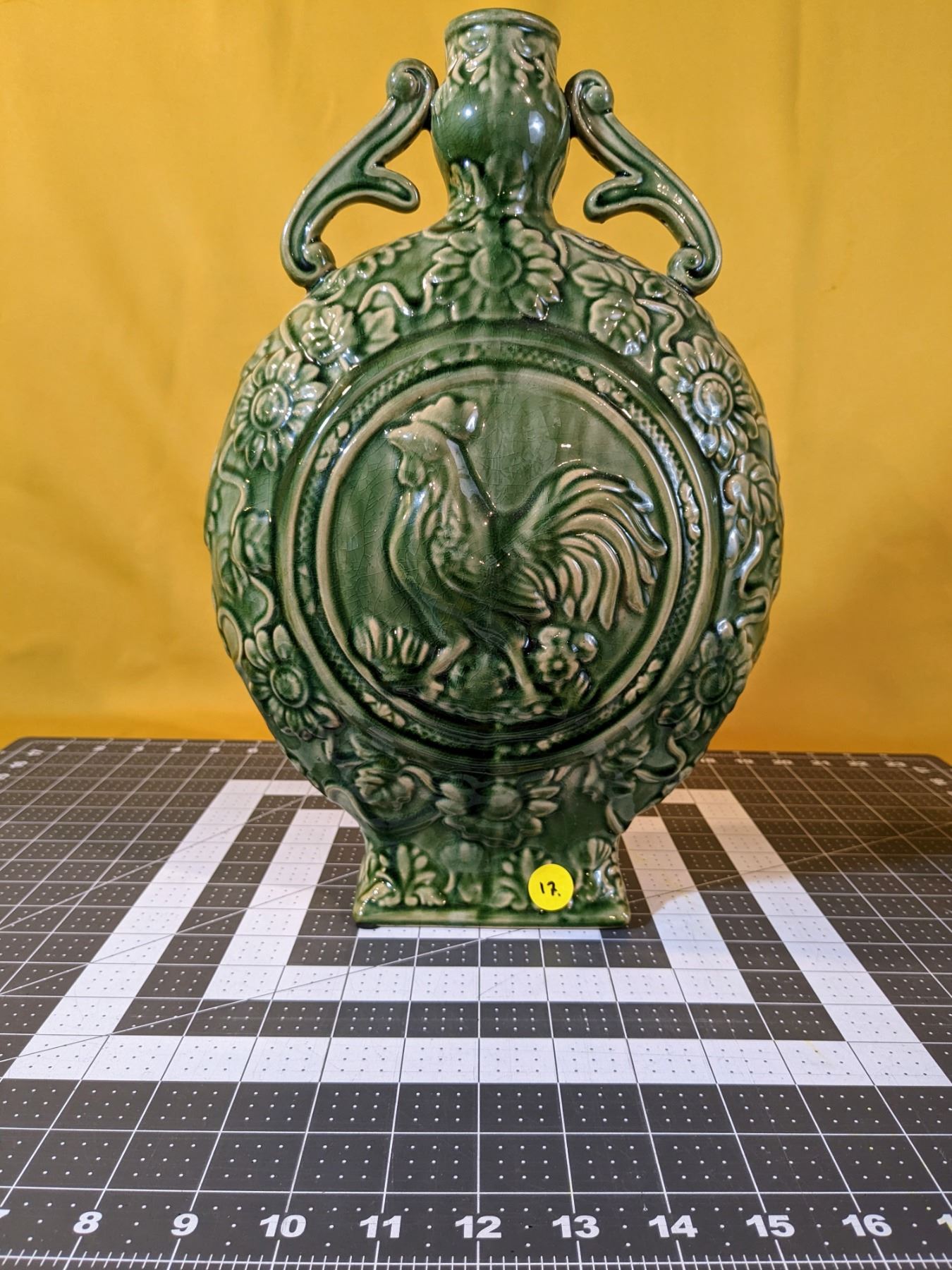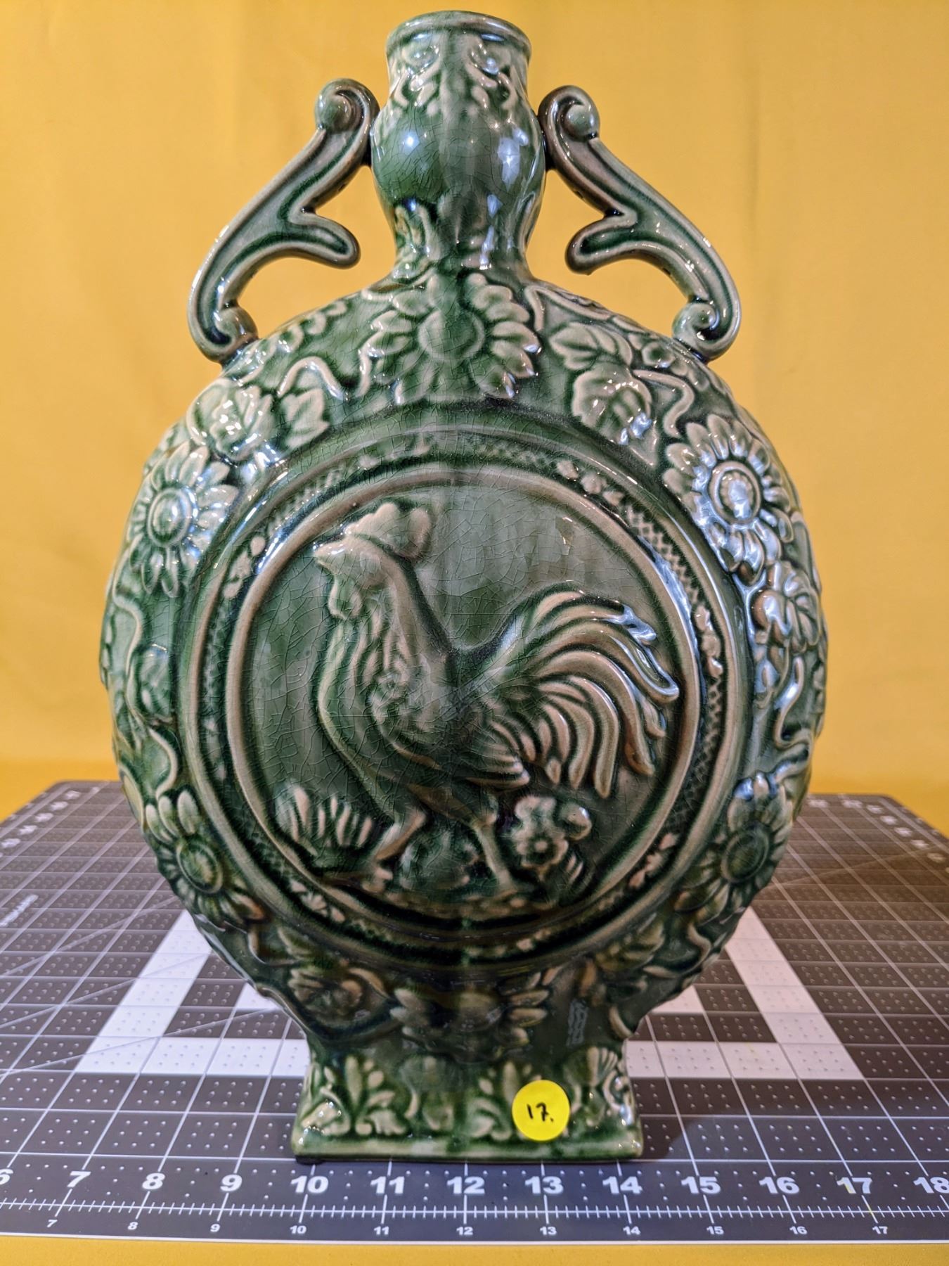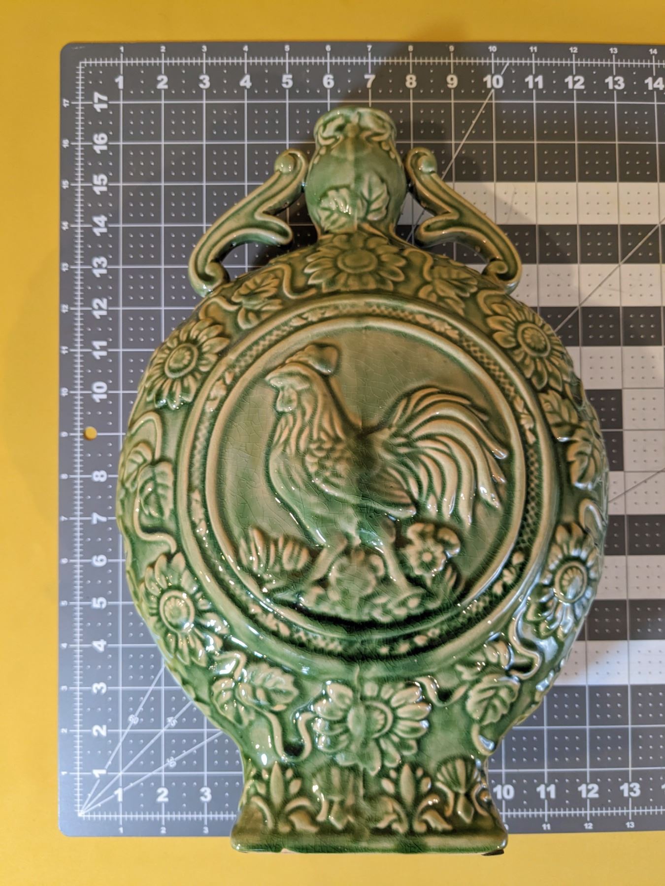 Green 14.5 in tall ceramic moon flask jug, with rooster and flower motif on both sides. Excellent condition.