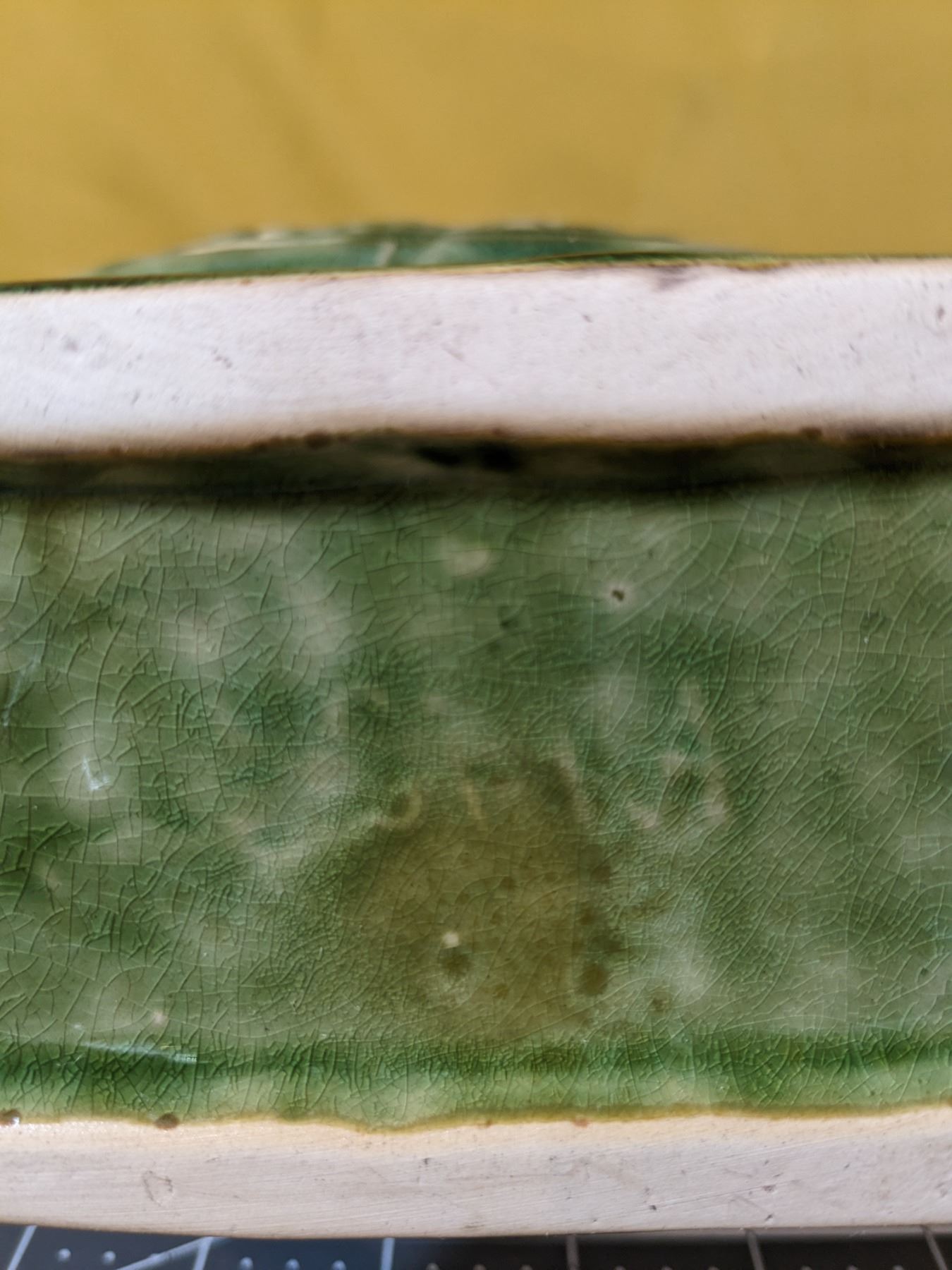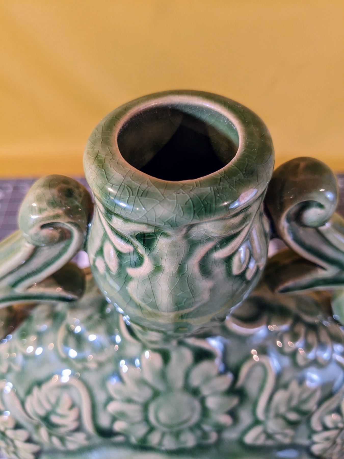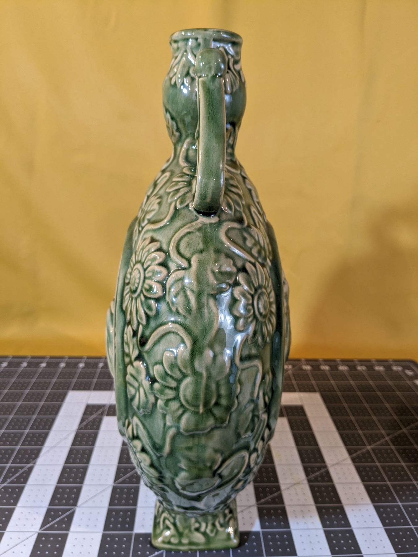 Green 14.5 in tall ceramic moon flask jug, with rooster and flower motif on both sides. Excellent condition.