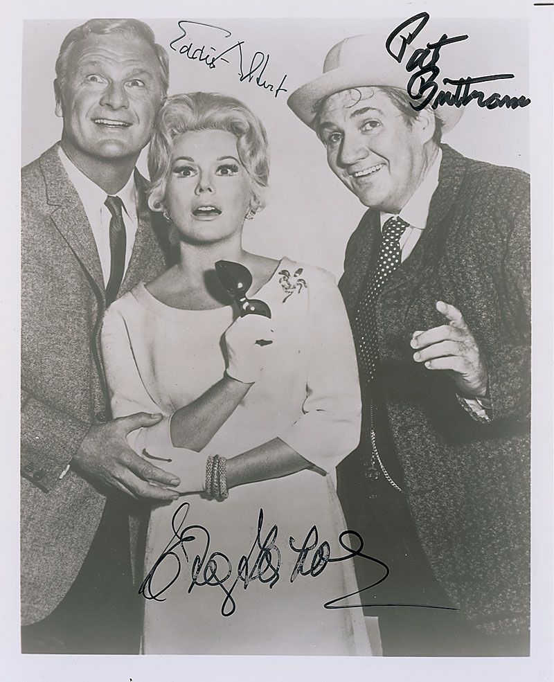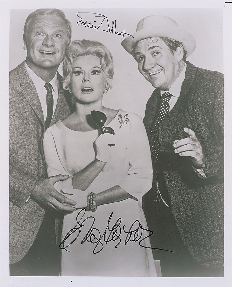 Two identical glossy 8 x 10 photos of the cast, one signed in black felt tip by Eddie Albert, Eva Gabor, and Pat Buttram, and the other signed by Albert and Gabor only. In overall fine condition, with slight irregular adhesion to Gabor’s signature on one photo.
