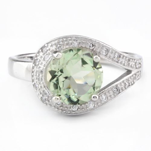 Throwback with a modern twist! This Victorian buckle style 1.8 carat genuine round cut Green Amethyst gemstone ring adds an update with the micro set White Sapphire gemstone accents. Set in Platinum over sterling silver for added brilliance. Size 8. 2.9g