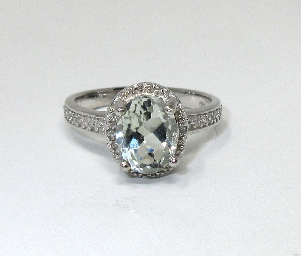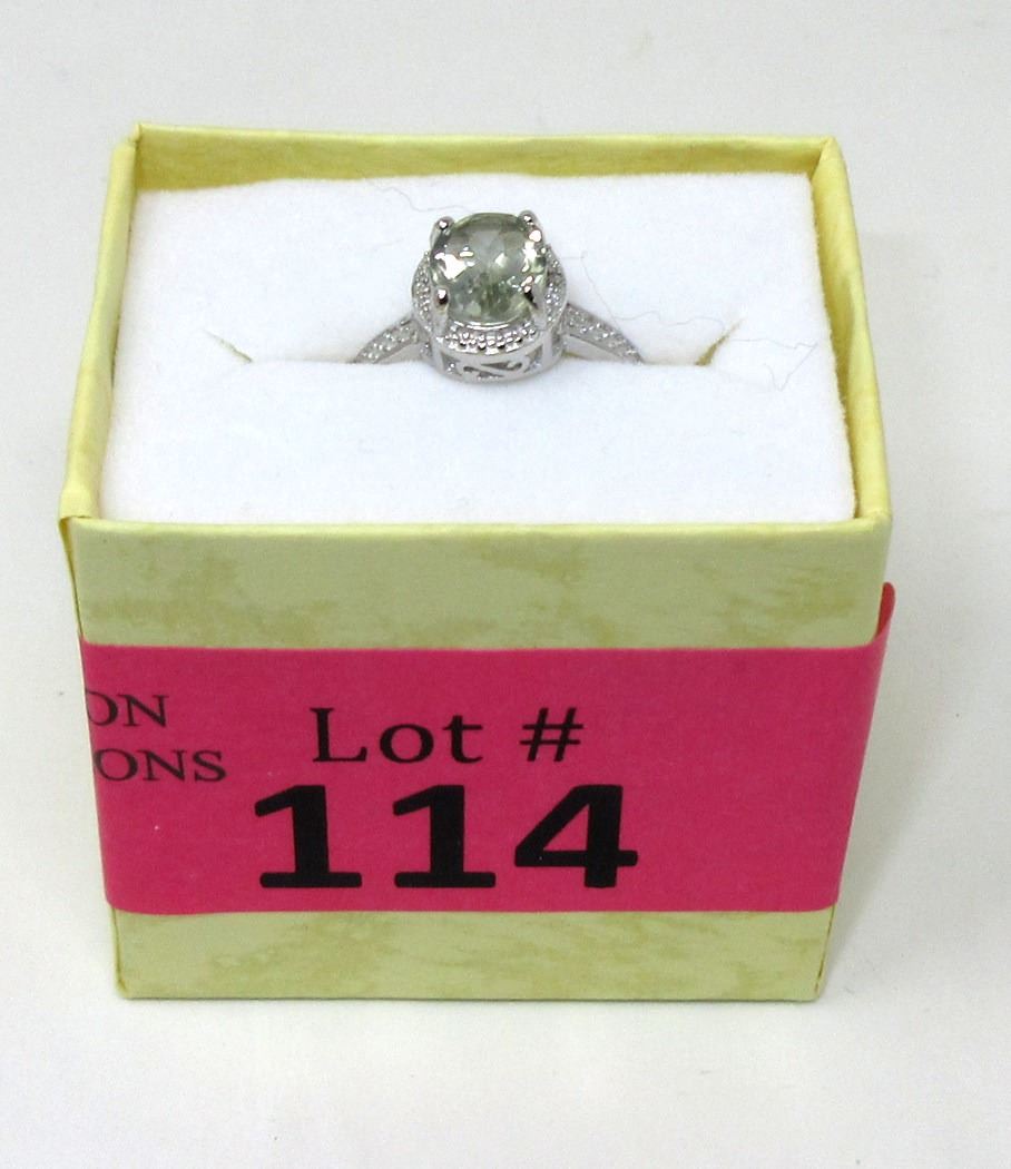 Sterling silver. Oval cut. Lovely, green yellow colour. 2 Side diamonds. Retail value $290.
