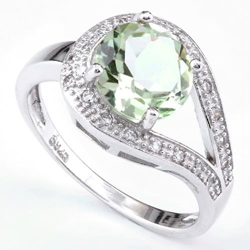 Large 1.8ct genuine Green Amethyst gemstone ring with sparkly created white sapphires accenting center stone. Set in Platinum over Sterling Silver. Size 8. 3.4g