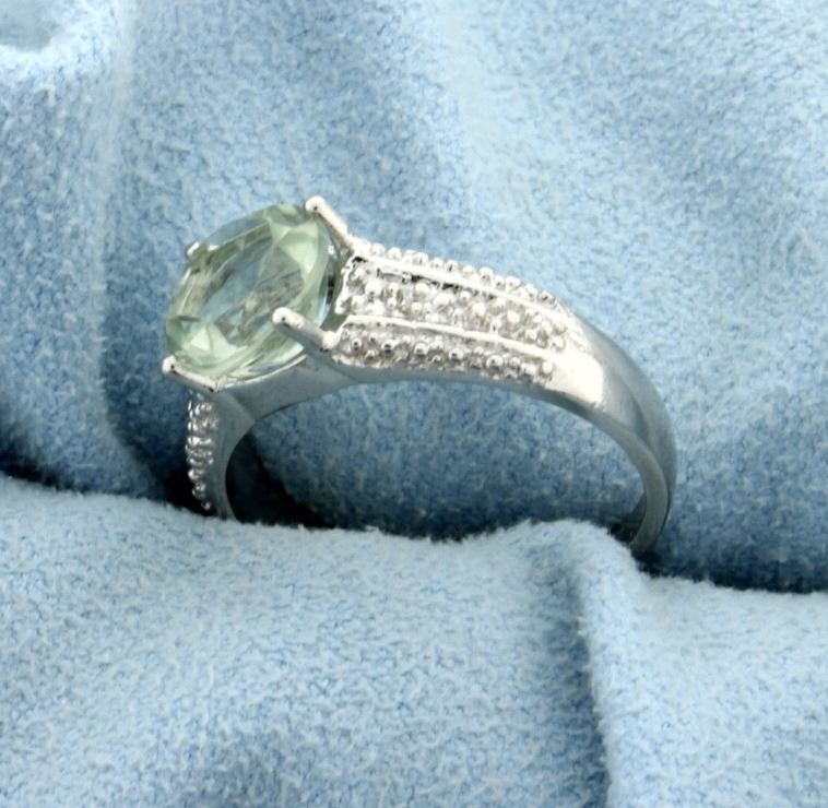 Contains one 1 3/4ct green Amethyst gemstones and two .01 ct Diamonds. Set in platinum over sterling silver. Size 7.25. 3.2g