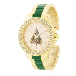 Green And Gold Metal Christmas Tree Cuff Crystal Metal Watch