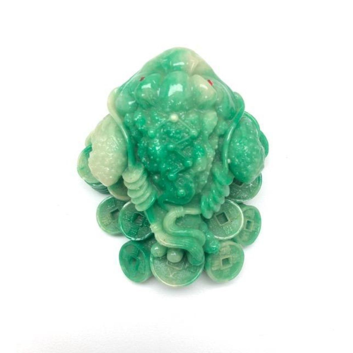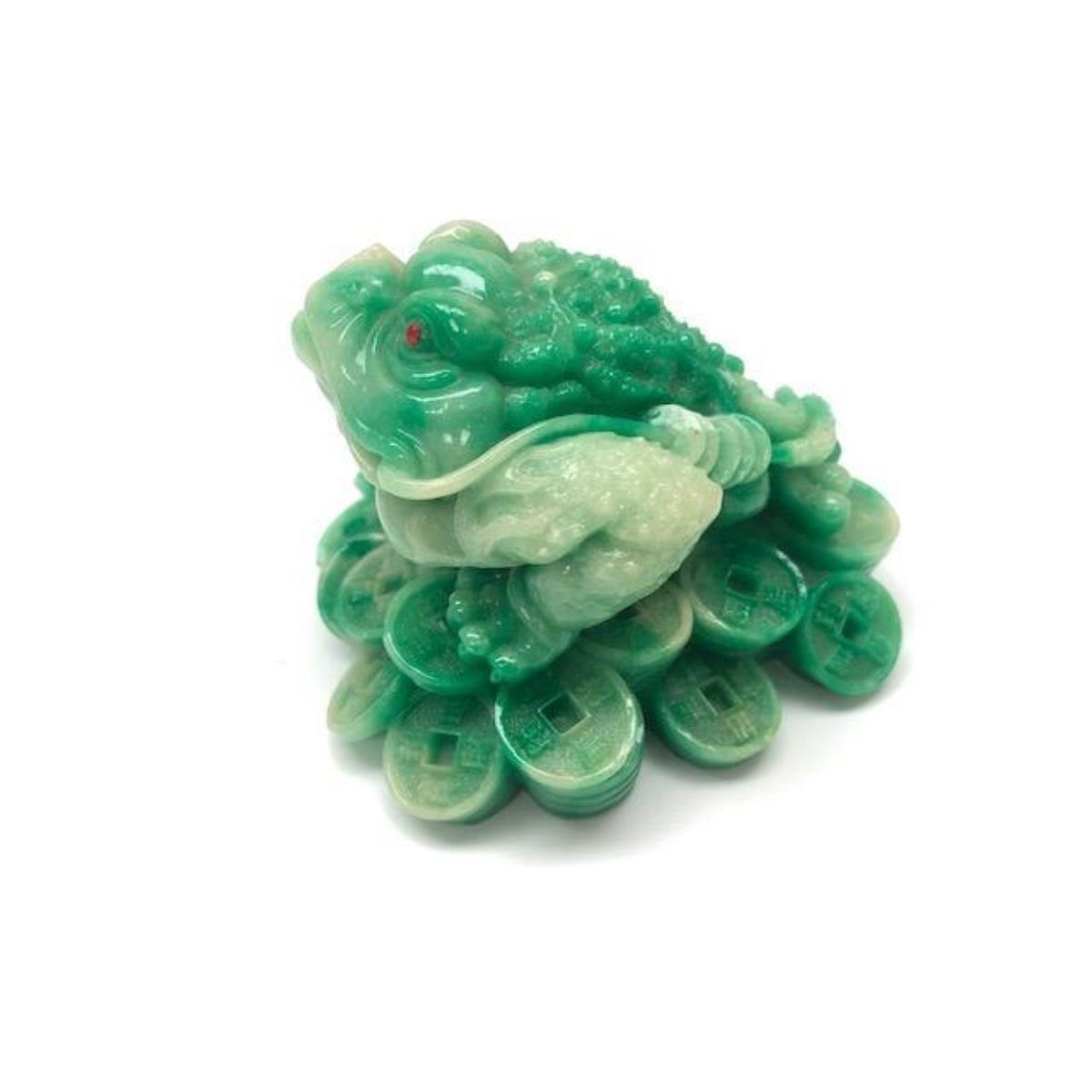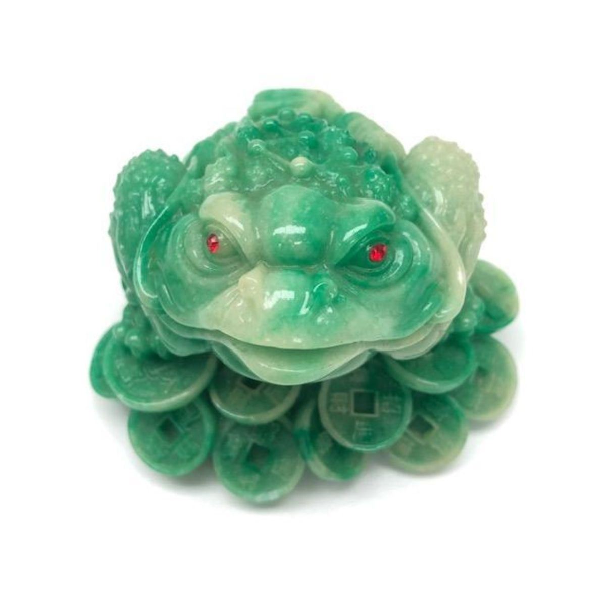 Green And White Money Toad With Red Semi-Precious Stones. Jin Chan Is Depicted As A Bullfrog With Red Eyes, Flared Nostrils, And One Hind Leg, Sitting On A Pile Of Traditional Chinese Cash With A Coin In It's Mouth. According To Feng Shui Beliefs, Jin Chan Helps Attract And Protect Wealth, And Guards Against Bad Luck. Because It Symbolizes The Flow Of Money, Jin Chan Should Never Be Positioned Facing The Main Door (Outwards). Height 3" View Photos For More Details.