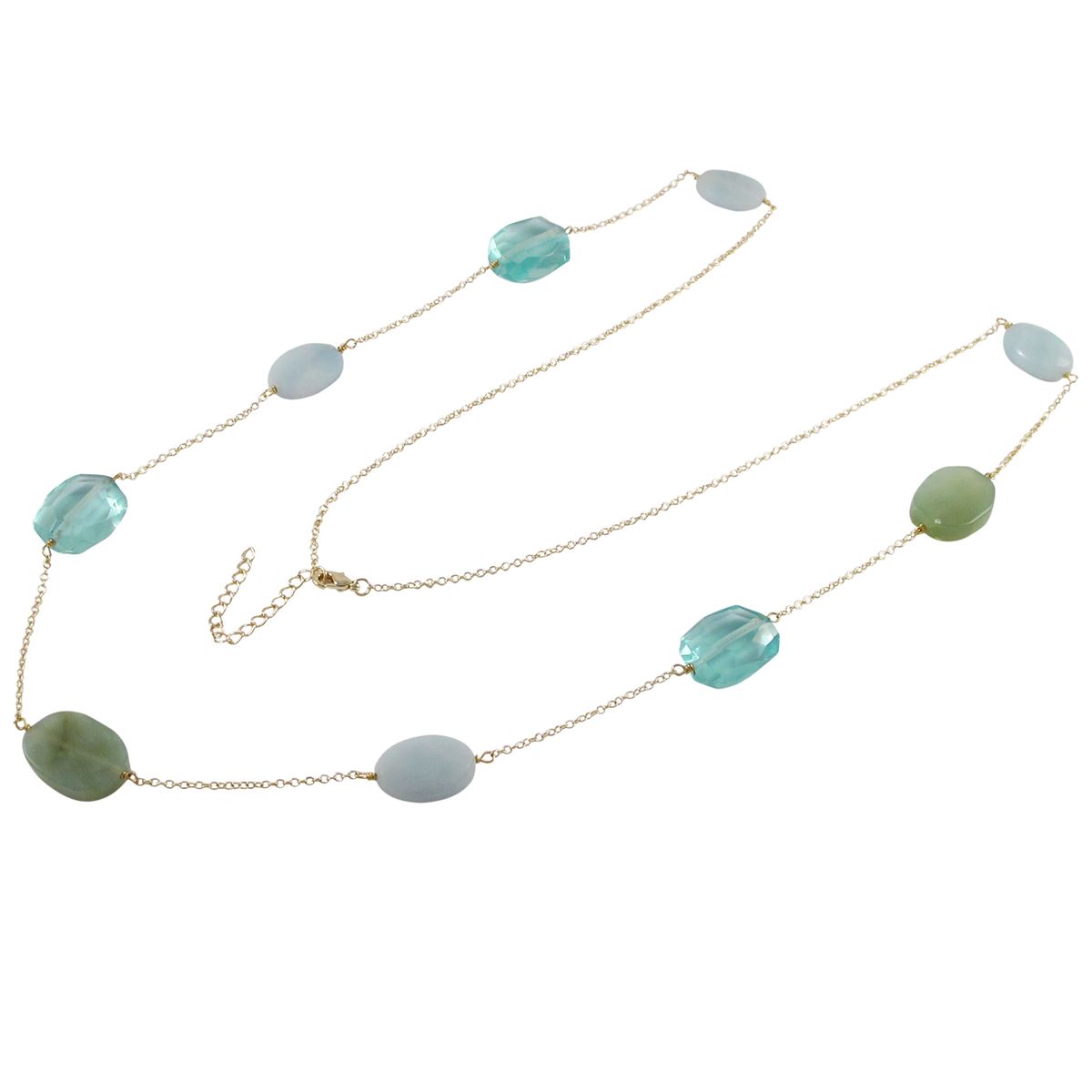 Green Aventurine And Aqua Combination Semi Precious Faceted Stones On Gold Plated Sterling Silver Chain- 36"