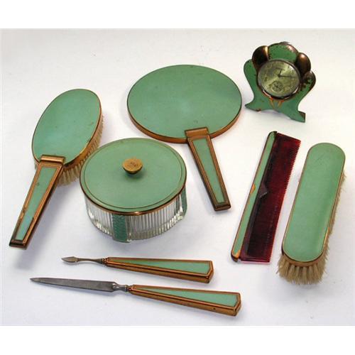 This old Art Deco dresser sets consists of eight (8) items including Hand Mirror, Hairbrush with Natural Bristles, Clothes Brush with Natural Bristles, Comb, Powder Jar with Lid, Clock, Nail File, Cuticle Utensil. They were produced, during the 1920s-1930s, in copper and green enamel - the clock is an old COMRADE pocket watch inserted into a frame. A few dings and a some wear to the enamel, due to age, otherwise all eight pieces are in excellent condition.