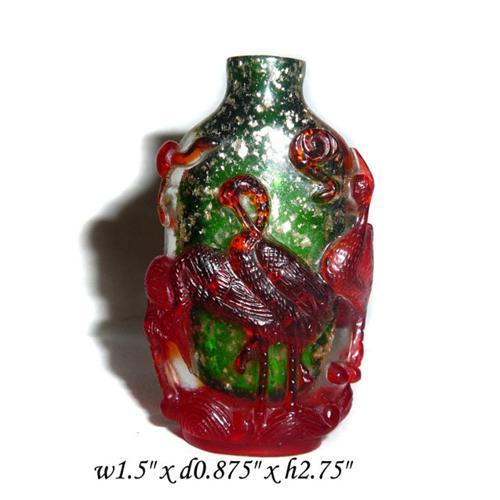 This is a hand-made high quality Peking glass snuff bottle. Inside the green base is golden flake mixed in. The red color overlay motif of cranes has precise detail. The decent and delicate make this snuff bottle a great collection item as well as a treasure gift. </p>