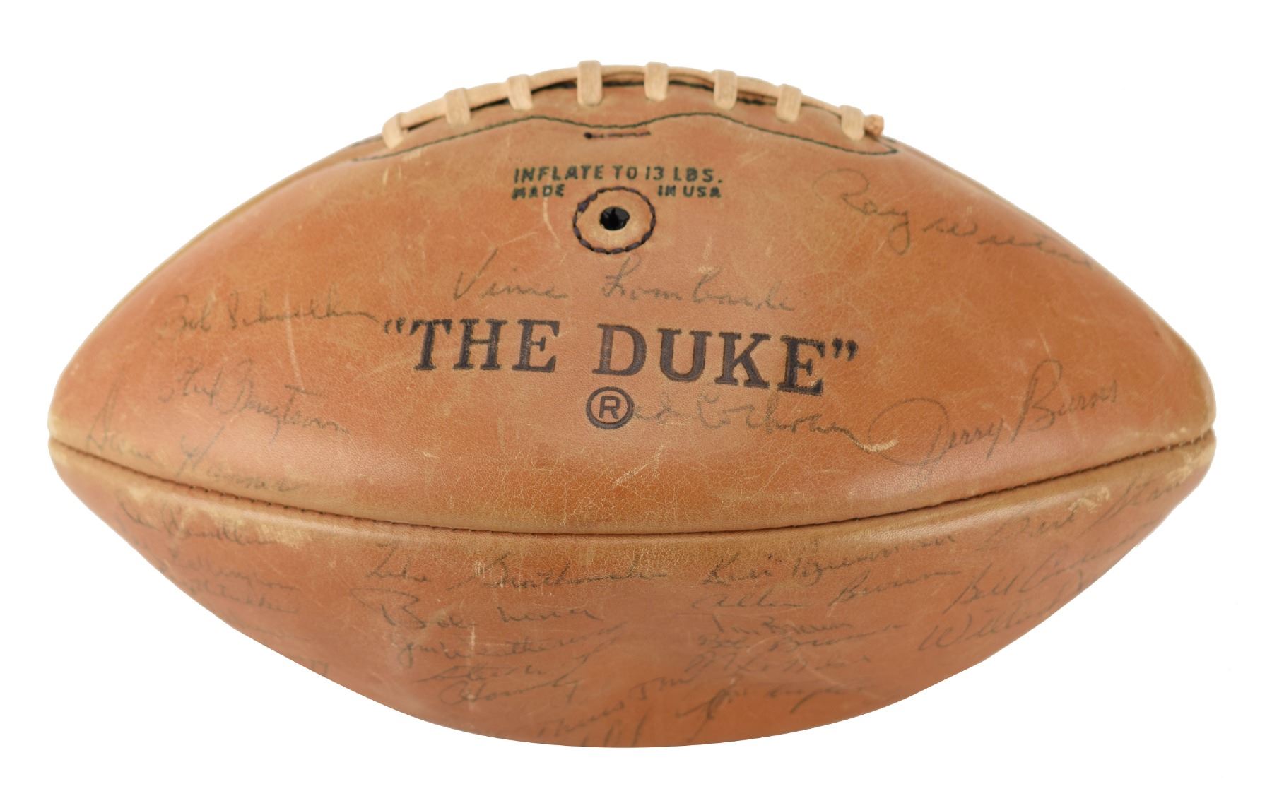 Rare official NFL 'The Duke' Wilson (Rozelle) football signed in black ballpoint by over 50 members of the 1966 Green Bay Packers football team, including: Bart Starr, Jim Taylor, Willie Wood, Ray Nitschke, Paul Hornung, Forrest Gregg, Willie Davis, Henry Jordan, Herb Adderley, Fuzzy Thurston, Lionel Aldridge, Elijah Pitts, Sonny Ridders, Jim Weatherwax, Ron Smith, Dave Hathcock (2), Roy Schmidt, Steve Wright, Dave Robinson, Eli Strand, Max McGee, Phil Vandersea, Marv Fleming, Kent Nix, Jeff White, Bob Schneller, Ray Wietecha, Jerry Burns, Jim Grabowski, Don Anderson, Zeke Bratowski, Allen Brown, Bob Long, Bob Jeter, Bill Anderson, Bob Skoronski, Doug Hart, Ken Bowman, Jerry Kramer, Lee Roy Caffey, Phil Bergstrom, Red Cochran, Dave Hanner, Bob Brown, Tom Crutcher, and more. The football features a Vince Lombardi signature done in a secretarial hand. In very good to fine condition, with light overall wear and scuffing, and the signatures a couple of shades light.