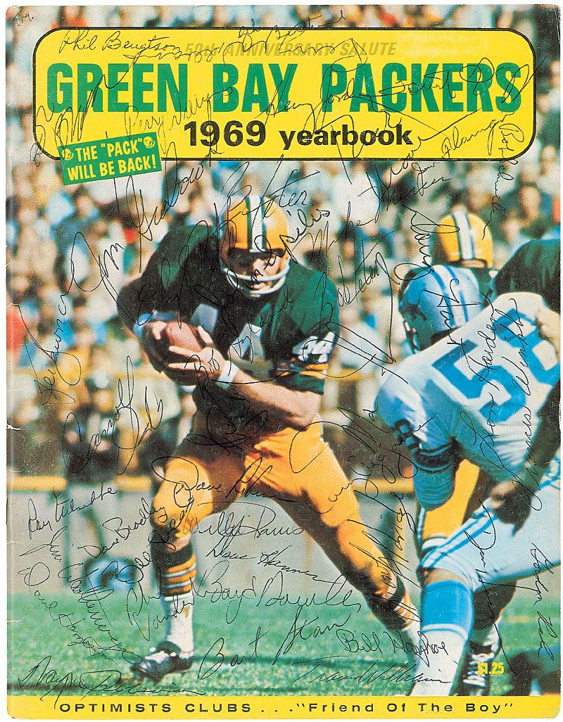 Official 1969 Green Bay Packers yearbook, 8.5 x 11, 64 pages, signed on the front cover in black ballpoint by over 40 members of the team. Signers include: Bart Starr, Henry Jordan, Travis Williams, Phil Bengston, Zeke Bratkowski, Dave Hanner, Boyd Dowler, Willie Davis, Carroll Dale, Forrest Gregg, Dave Robinson, Elijah Pitts, Ray Nitschke, Bob Jeter, Lionel Aldridge, Ken Bowman, Bob Brown, Marv Fleming, Jim Grabowski, Doug Hart, and Bob Schnelker. In fine condition. Williams, a running back on the 1967 Packers championship team, is a particularly difficult autograph to find.