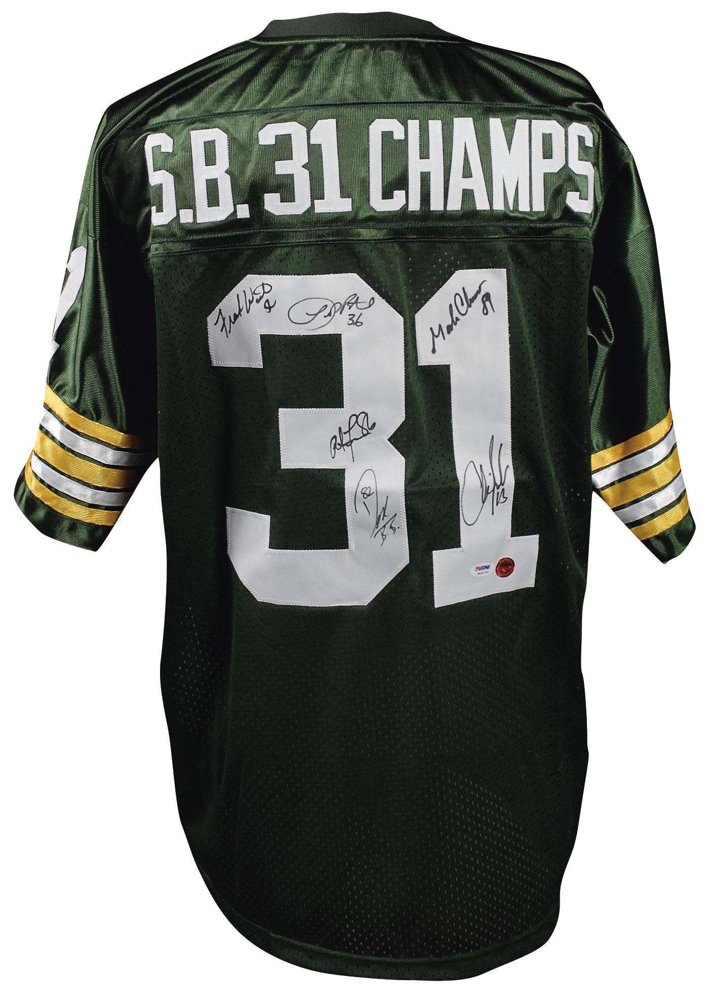 Official replica Green Bay Packers Super Bowl XXXI commemorative football jersey, with sewn on letters and numbers, signed in black felt tip on the number on the back by six members of the World Champion Packers: Mark Chmura, Chris Jacke, Antonio Freeman, Frank Winters, Leroy Butler, and Don Beebe. Accompanied by a certificate of authenticity from PSA/DNA. In very fine condition. RRAuction COA.