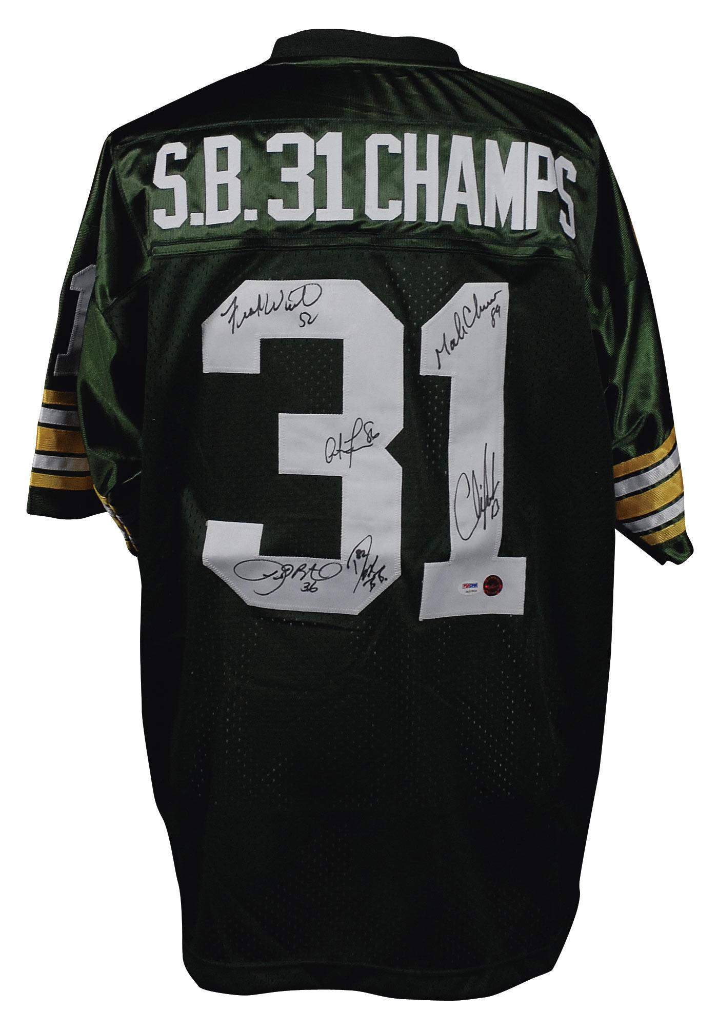 Replica Green bay Packers Super Bowl XXXI commemorative football jersey, with sewn on letters and numbers, signed in black felt tip on the number on the back by six members of the World Champion Packers: Mark Chmura, Chris Jacke, Antonio Freeman, Frank Winters, LeRoy Butler, and Don Beebe. Accompanied by a certificate of authenticity from PSA/DNA. In very fine condition. RRAuction COA.