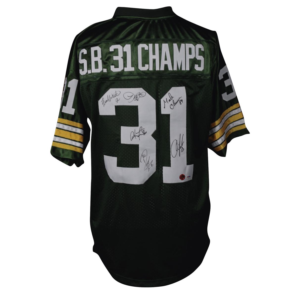 Commemorative replica Green Bay Packers Super Bowl XXXI football jersey, with sewn on letters and numbers, signed in black felt tip on the number on the back by six members of the World Champion Packers: Mark Chmura, Chris Jacke, Antonio Freeman, Frank Winters, Leroy Butler, and Don Beebe. In very fine condition with a PSA/DNA authentication label affixed and accompanied by a certificate of authenticity from PSA/DNA.
