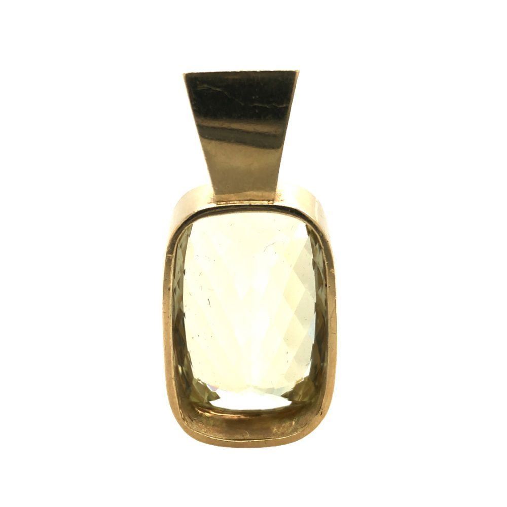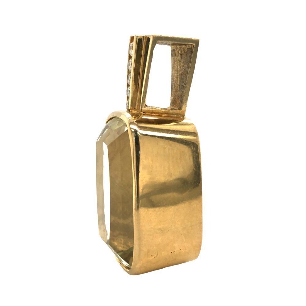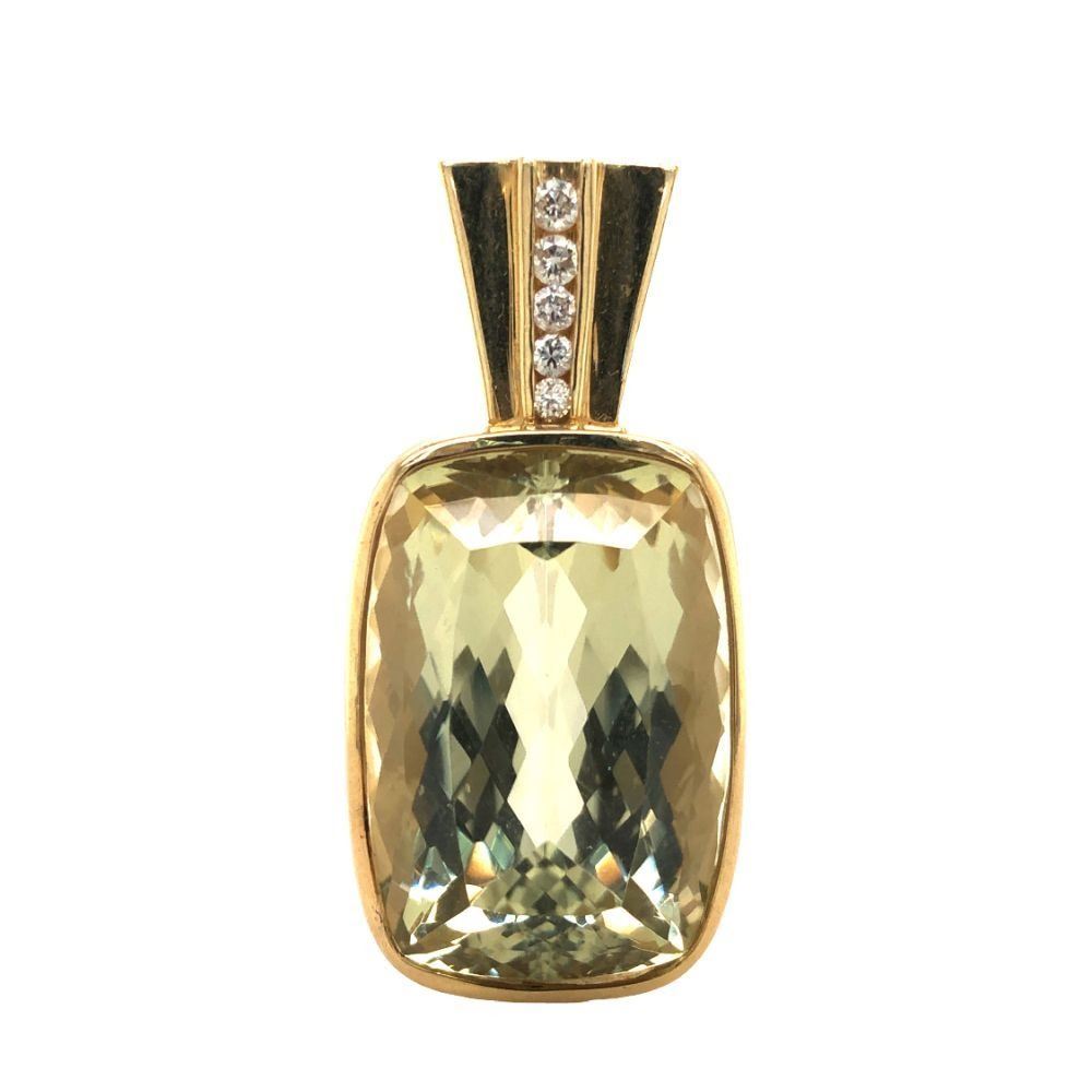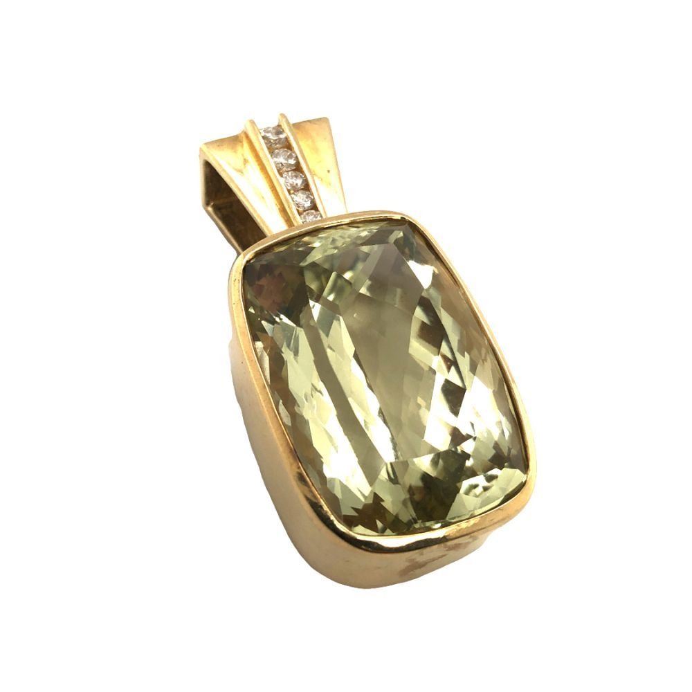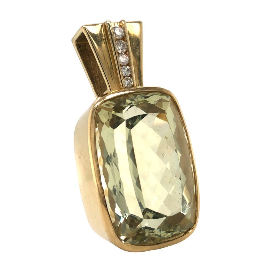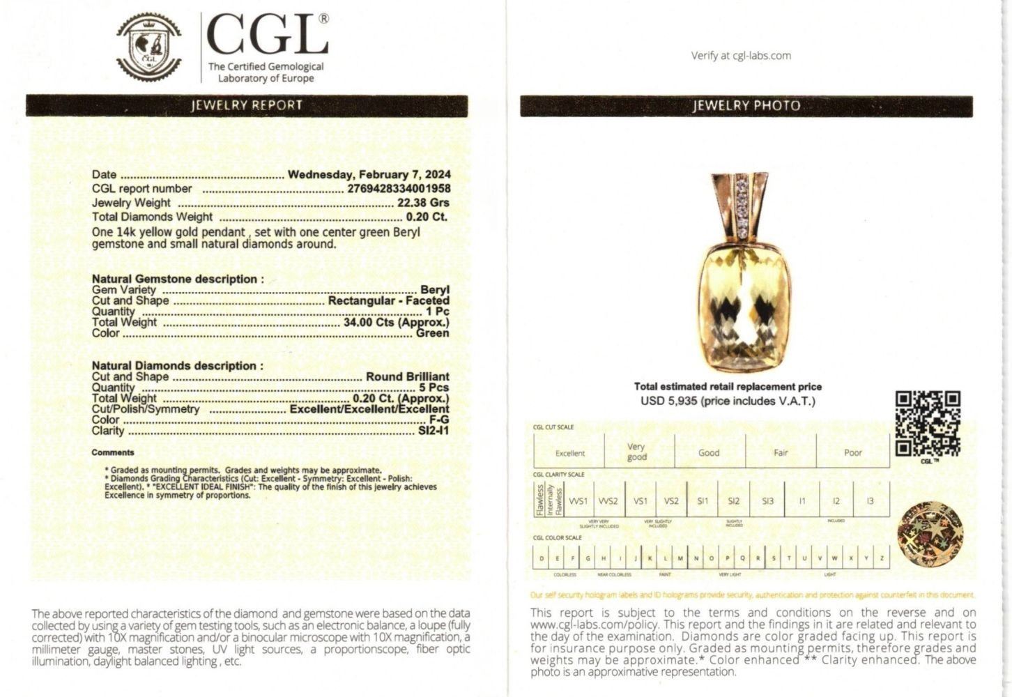 ADDITIONAL INFORMATION: If you are unfamiliar with green beryl, we would like you to meet emerald's little-known cousin; also related to aquamarine and morganite!& nbsp; This spectacular bright, sparkling green beryl is beautifully faceted and wrapped in an extra-wide yellow gold bezel (approximately 11.5mm wide and 1.1mm thick).& nbsp; A solid, tapered bail with channel-set diamonds is affixed to the top of the pendant.& nbsp; The bail tapers from approximately 6mm to 11mm and can accommodate an approximate 5.5mm wide chain.